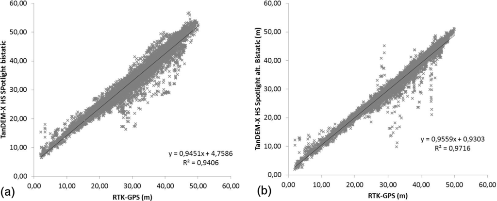 When the height values of the RTK-GPS field survey are plotted against the data from the TanDEM-X HS experimental products, the impact of the optimized interferometric processing using the alternating bistatic information is evident (Figure 8). The plot on the left-hand side includes DEM values after standard processing (ALT-1) using another, coarse resolution input DEM as reference (here: SRTM-C V4). On the right, the interferometric workflow was adjusted by using the first DEM (ALT-1) as reference for processing the second (ALT-2). The scatterplots and accompanied statistics not only underline the improved fitting of the TanDEM-X HS ALT-2 product in terms of coefficient of determination and spreading of height values around the regression line. It is also obvious from the plots that the alternating bistatic merge processing results in a significant decrease in the offset of the regression line (4.75 to 0.93 m) and thus reduces the systematic error in absolute height estimation from TanDEM-X HS data. The remaining systematic error of 0.93 m is assumed to be a consequence of the introduced errors from the interferometric processing workflow using the SRTM C-band DEM in a first step and the resulting TanDEM-X bistatic ALT-1 product as input.