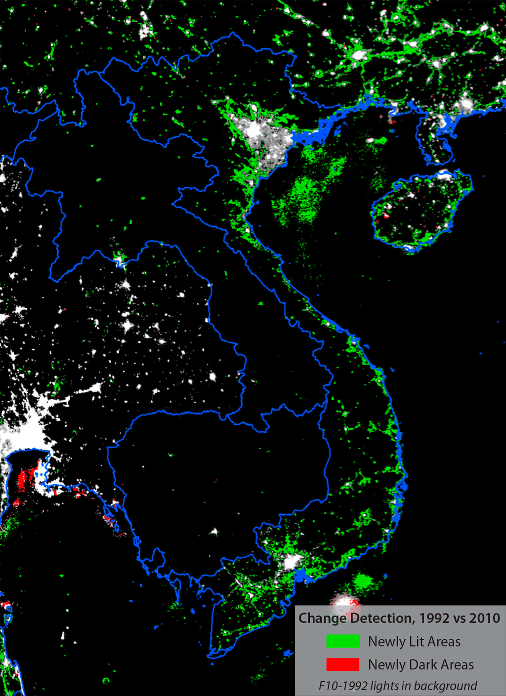 Electricity consumption in Vietnam has increased rapidly in recent decades. Nighttime satellite imagery provides visual evidence corroborating these notable accomplishments. Figure 1 is a change detection image comparing average time stable night lights in 1992 and 2010, as produced by NOAA’s National Geophysical Data Center. Green areas show the outcomes of electrical grid expansion and rural electrification programs, highlighting places that were dark in the 1992 image but appear lit in 2010, while red areas are places that have become dark over the same timeframe. Overall, the image captures a considerable increase in the spread and coverage of electricity provision over the last two decades in Vietnam.