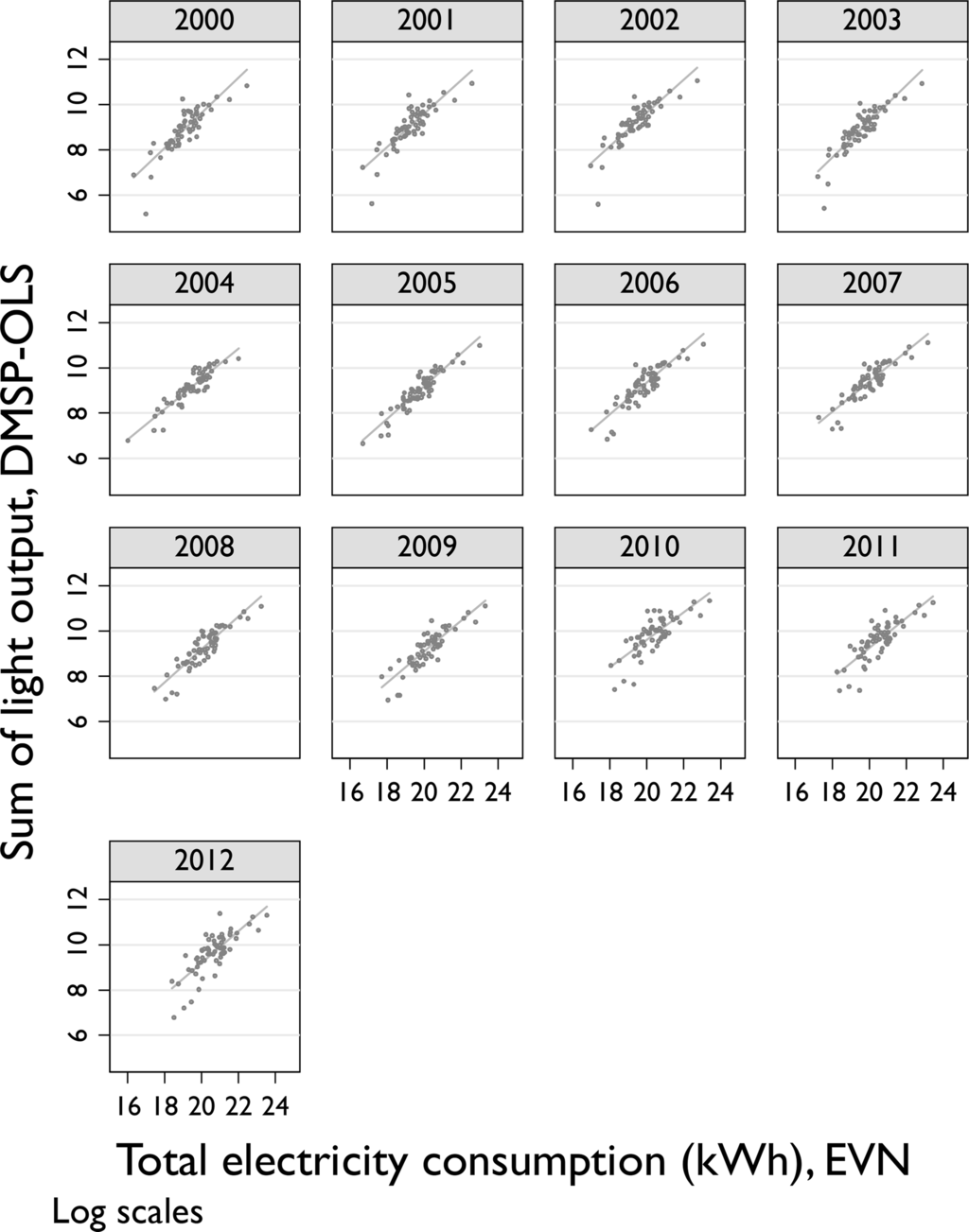 To first establish the relationship between night lights and electricity consumption, we compare satellite measures of light output against official data on electricity consumption. The most disaggregated level for which consumption data are reported is at the province level, the second-level administrative unit in Vietnam. The country’s main power utility company, EVN, reports total electricity consumption at the province level in each year from 2000 to 2010. For each year, we also computed the total brightness of each province from the corresponding annual composite imagery of time stable night lights. This was done by summing the brightness levels of each 30 arcsecond pixel located within the boundaries of each province, using boundary shapefiles from the FAO’s Global Administrative Unit Layers (GAUL) project.