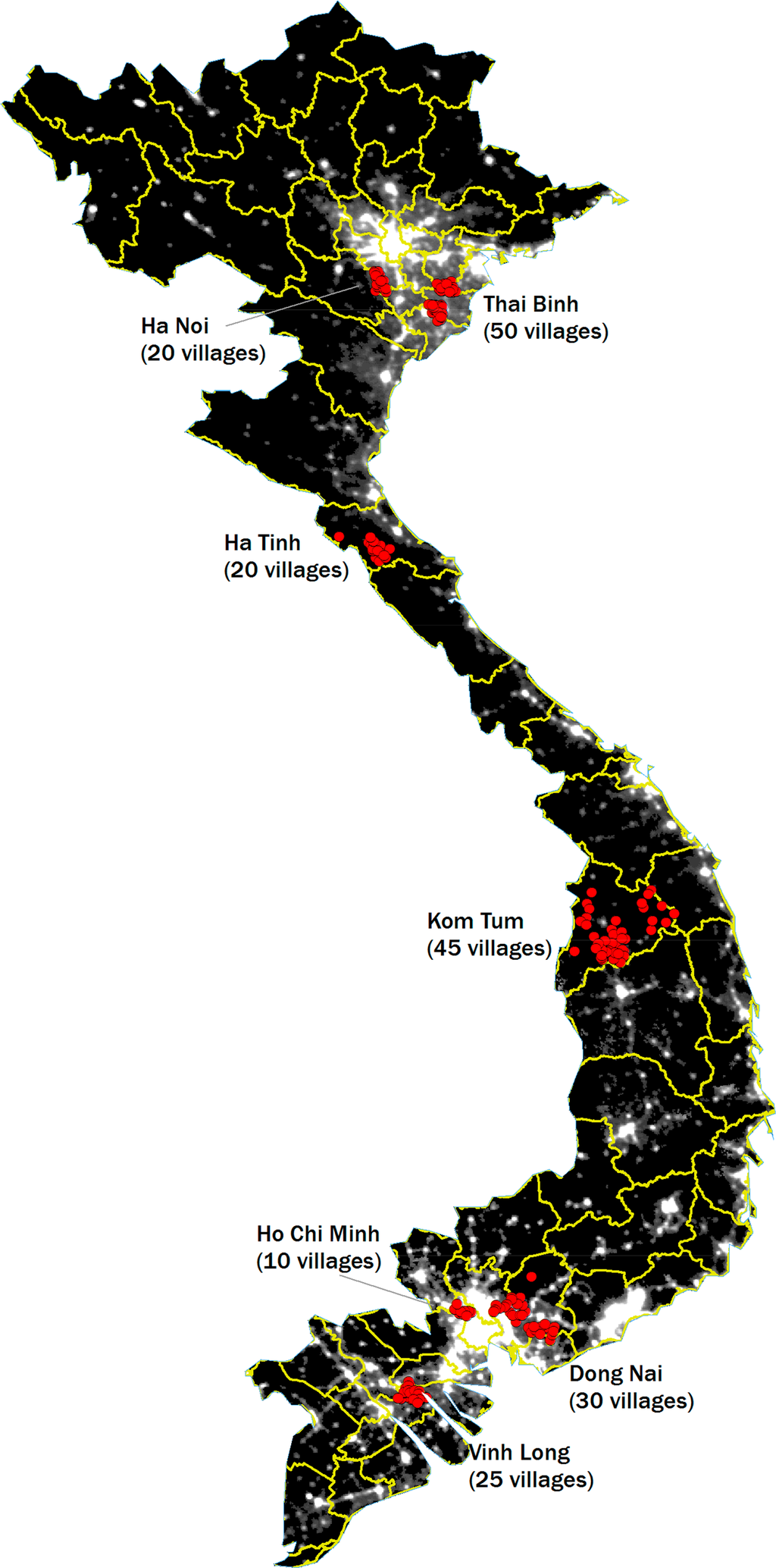 To further study the relationship between electricity use and nighttime light output in Vietnam at an even more disaggregated level, our project team administered surveys in 200 village-level units across Vietnam. The villages were drawn from seven provinces representing a range of geographic and economic conditions. The surveys were administered by trained staff from the Vietnam Institute of Energy from 26 August to 25 September 2013.