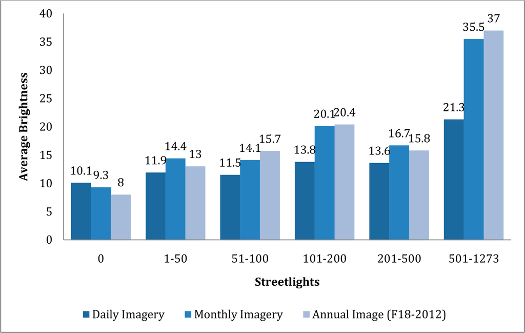 The average brightness of villages with no streetlights was 10.1 in the 90-night time series and 9.3 across the three monthly composites spanning August to October 2013. In contrast, the 12 villages with more than 500 streetlights were more than twice as bright: 21.3 in the nightly series, 35.5 in the monthly composites, and 37 in the annual composite image for 2012.