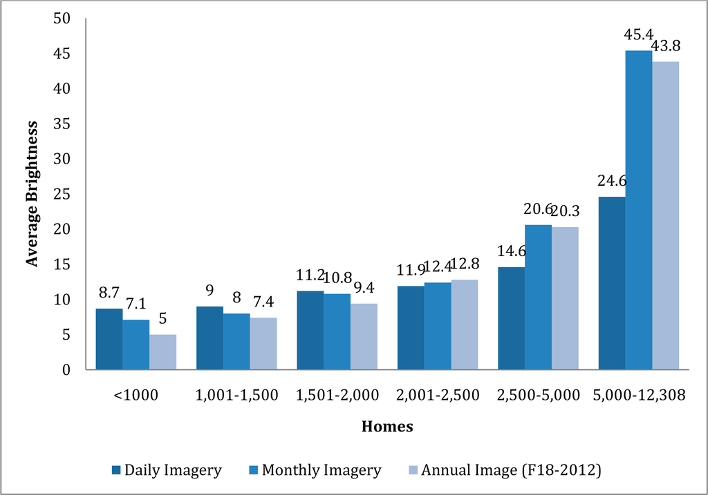 All villages in our survey reported that electricity was available in all homes in their villages. Thus, the number of homes is a reasonable indicator of how much electricity is used in a village for domestic purposes. Villages with more electrified homes appear consistently brighter in the nightly time series, the monthly composite data, and the annual composite image from 2012 (see Table 3 and Figure 5).