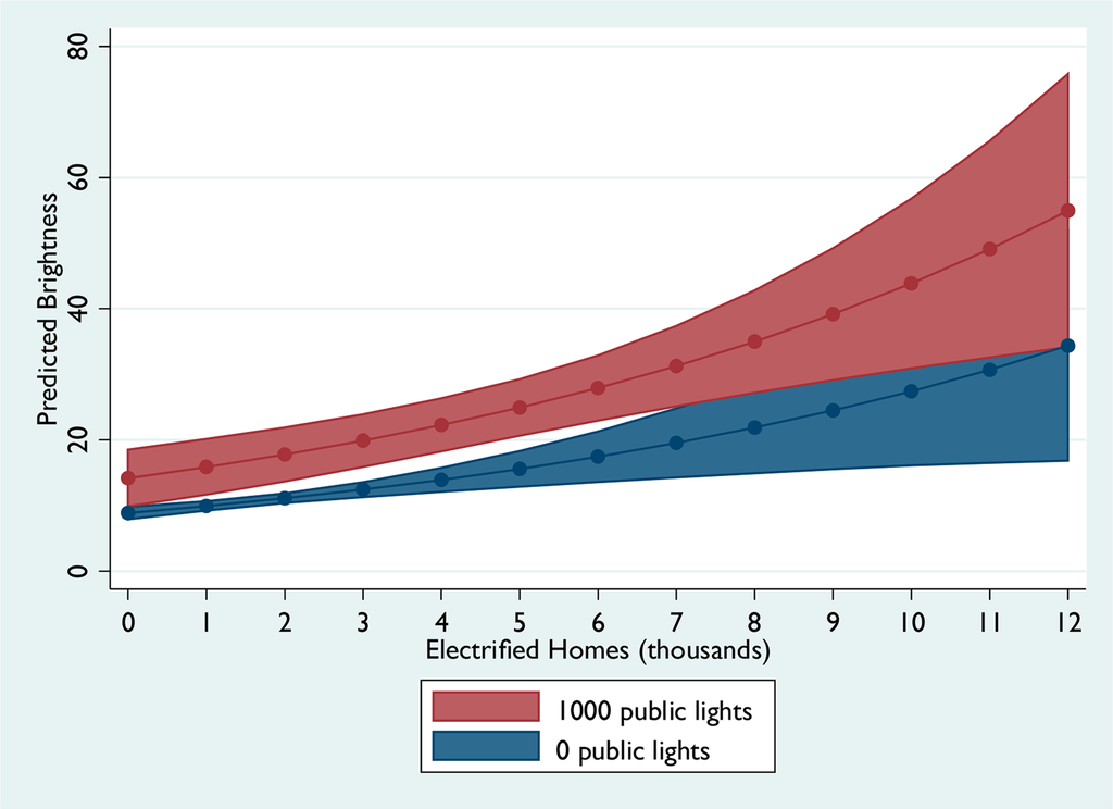 The statistical effect of public outdoor lights and electrified homes is consistently positive and robust across all these models. In substantive terms, the models predict that a 1-point increase in brightness for every 125–200 public outdoor lights and an additional 1-point increase for every 550–700 electrified homes.