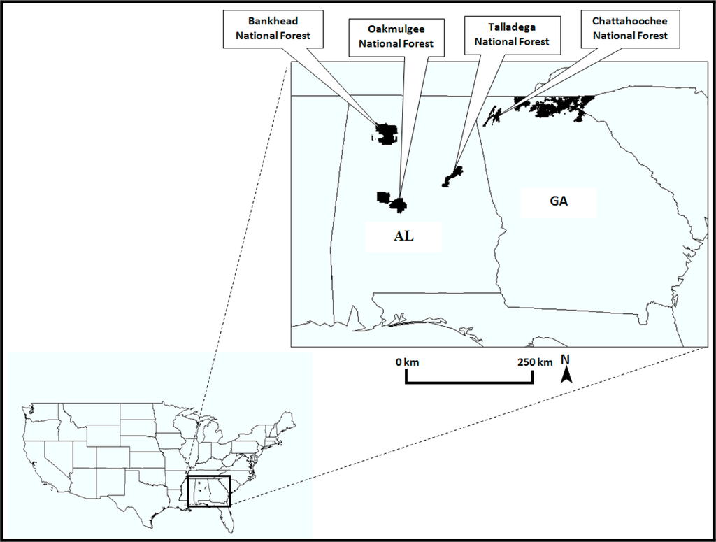In order to examine the issues listed above and to be consistent with Al-Hamdan et al. [31,32], Landsat TM images were obtained that covered four U.S. national forest areas wherein the forest stand characteristics (trunk size, species, age, etc.) are known with a good degree of precision and spatial detail. Topographic data were also obtained from the United States Geological Survey (USGS) geographic data sets in order to be used in the analysis. The Forest Inventory and Analysis (FIA) data were obtained from the U.S. Forest Service for Talladega National Forest (AL), Oakmulgee National Forest (AL), Bankhead National Forest (AL), and Chattahoochee National Forest (GA). Figure 1 shows the locations of the study areas. There are three size classes within the forest data sets: sawtimber, poletimber, and saplings. The diameter at breast height (DBH) values for those classes are greater than 9 inches (22.9 cm), 5 to 9 inches (12.7 to 22.9 cm), and 1 to 5 inches (2.5 to 12.7 cm), respectively. Significant species includes longleaf-slash pine, shortleaf-loblolly and white oak, red oak, hickory, sweetgum, ash, and yellow-poplar.