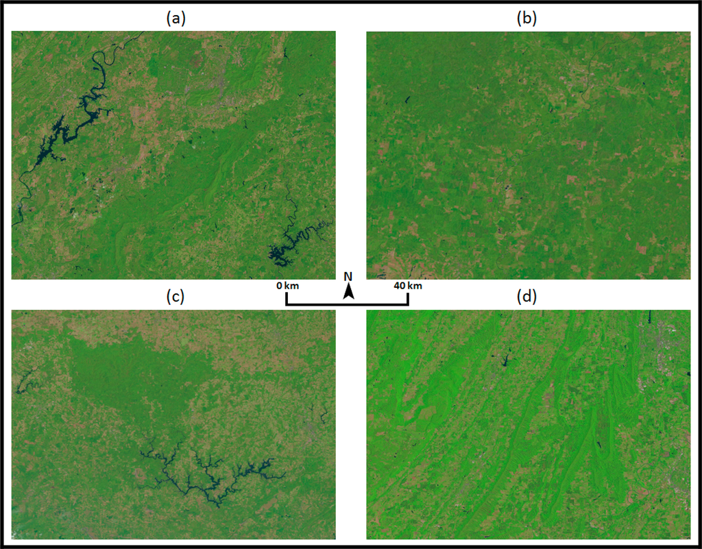 Samples were collected randomly from the images for each forest area, obtaining equal coverage of all parts of the forests [31]. Sample size was chosen to be 100 × 100 pixels based on a review of the research literature [50,51]. As shown in Figure 3 the total numbers of collected samples were 36, 52, 32, and 31 for Talladega National Forest (AL), Oakmulgee National Forest (AL), Bankhead National Forest (AL), and Chattahoochee National Forest (GA), respectively. The FD and Moran’s I values were calculated for all bands of the Landsat TM coverage except the thermal infrared band (Band 6), which has a different spatial resolution. The Image Characterization and Modeling System (ICAMS) [48] module was used to calculate the spatial indices as described in Al-Hamdan et al. [31]. The averages of FD and Moran’s I for each sample were calculated using the results of all Landsat TM bands except Band 6, which was excluded due to its different spatial resolution as discussed previously.