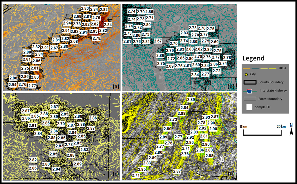 The concept of spatial complexity indices to extract forest structure attributes is based on the relationship between forest canopy characteristics and trunk diameter DBH [31,32,34–43]. As crown width increases, stand diameter increases and stand density (trunks/unit area) decreases. The goal is to obtain a relationship between DBH and FD or I, such that the spatial indices can then be used to estimate the stand attributes. Al-Hamdan et al. [31] have demonstrated the mechanism by which crown complexity or roughness measures can be characterized by fractals or spatial correlation depending on the mixture of large and small trees and the resulting homogeneity or heterogeneity of the forest canopy surface. For each sample, the forest stand data were extracted, including percent of each size class present (sawtimber, poletimber, saplings), percent of each category of species (hardwood and softwood), age and elevation using the national forests vector GIS data obtained from the Forest Service and the digital elevations GIS data obtained from the Earth Resources Observation Systems (EROS) Data Center. The computed FD and I were then related to the stand variables using linear regression as reported for the Oakmulgee forest by Al-Hamdan et al. [32]. Table 2 lists summary statistics of all the in situ and computed variables for each study area, and Table 3 lists the FD and Moran’s I values at the minimum and maximum percentages of each stand size class and category of species among all study areas. The computed FD is shown for each sample in Figure 3, as well.