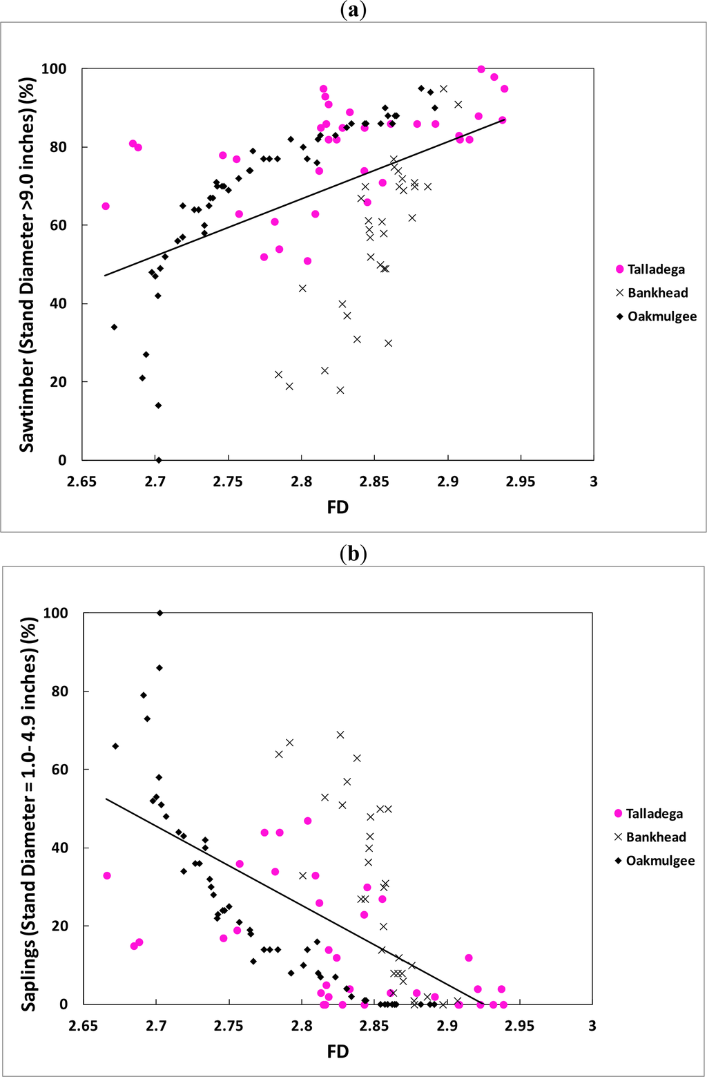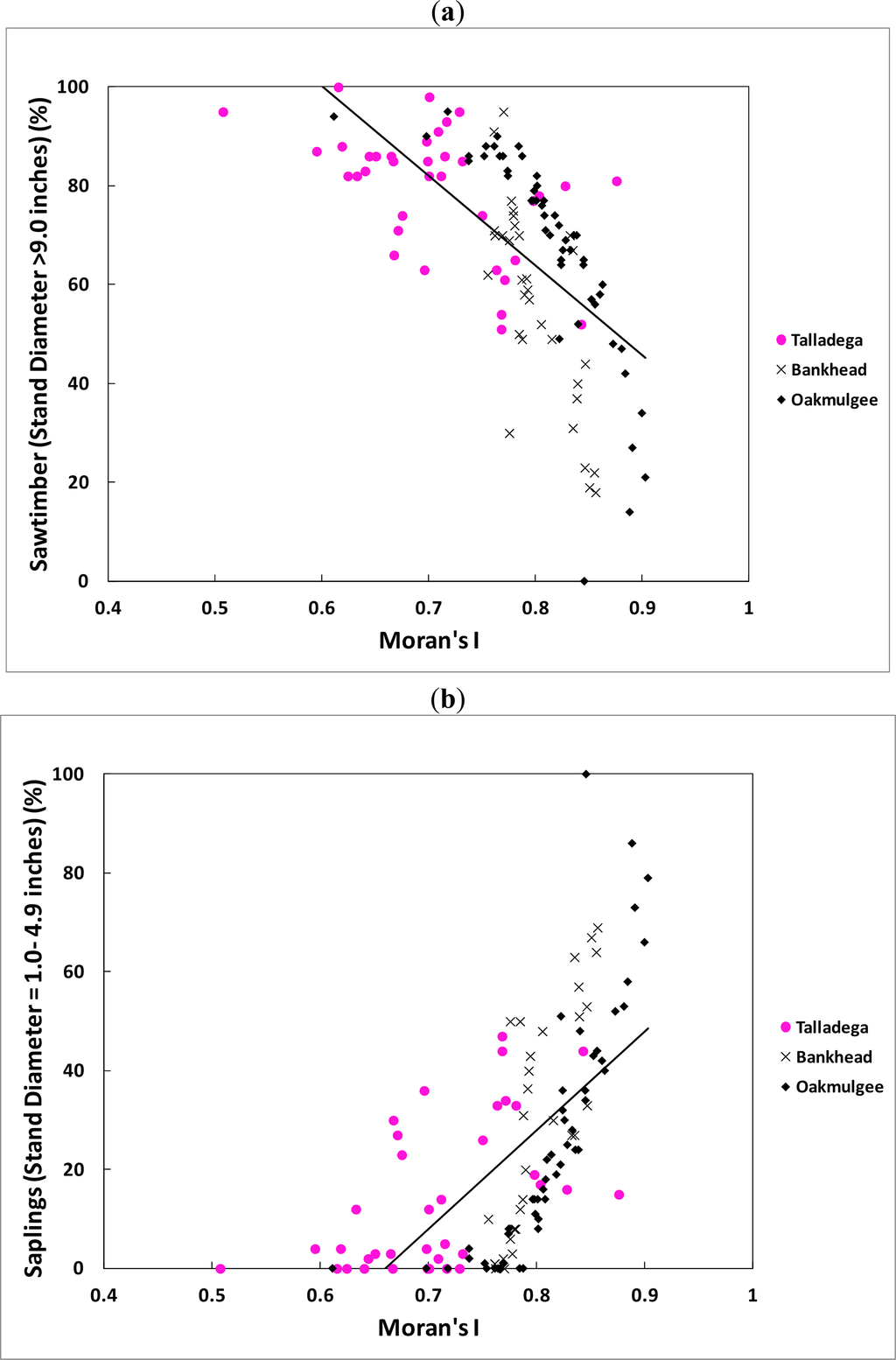 All the regressions showed that the fractal dimension (FD) increased (positive slopes) and the Moran’s I decreased (negative slopes) as the sawtimber (DBH > 22.9 cm) percentage increased. The regressions also showed that FD decreased (negative slopes) and Moran’s I increased (positive slopes) as the saplings (DBH = 2.5–12.7 cm) percentage increased. These results are consistent with the discussion given above in regard to the relationship between the spatial indices, the crown dimensions and the stand characteristics.