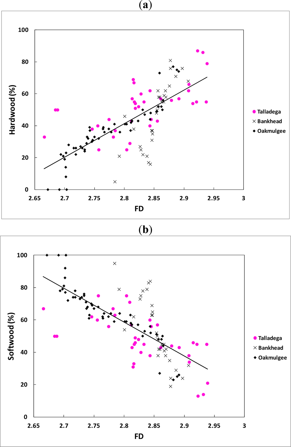 Table 4 shows that all of the regression slopes were significantly different than 0 (α = 0.05) with the exception of three cases. These same three cases (Talladega I vs. Poletimber %; Bankhead FD vs. Poletimber %; Bankhead I vs. Poletimber %) also showed relatively low coefficient of determination (R2) values. In addition, the correlation coefficient (r) values for poletimber are not significant at the 0.05 level in the cases of FD and I for Talladega National Forest. In all other cases a significant linear relationship does appear to exist between the variables. Thus, it appears that the spatial indices may not be able to clearly distinguish poletimber in all cases, but that they can detect larger trunk sizes (sawtimber) and smaller diameters (saplings) effectively.