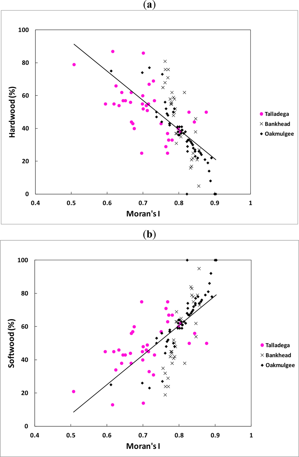 All the regressions showed an increase (positive slopes) in fractal dimension (FD) and a decrease (negative slopes) in Moran’s I as the hardwood percentages increased while all the regressions showed a decrease (negative slopes) in fractal dimension (FD) and an increase (positive slopes) in Moran’s I as the softwood percentages increased. The explanation for this result is as given above because softwood trees (for example, pine trees) are mostly with small crowns, while hardwood trees (such as oak trees) likely have large crowns. As a matter of fact, the category of species case had even stronger correlations with the average spatial indices than the Diameter at Breast Height (DBH) case. This can be due to the fact that remote sensing data do not measure DBH directly, but they measure crown reflectivity by satellite sensors. Thus, for a given tree species, the reflectance value recorded by satellite sensors is a function of exposed projection area (canopy closure). The strong relationship between the spatial indices and both categories of species therefore offers an alternative method of estimating stand density parameters.