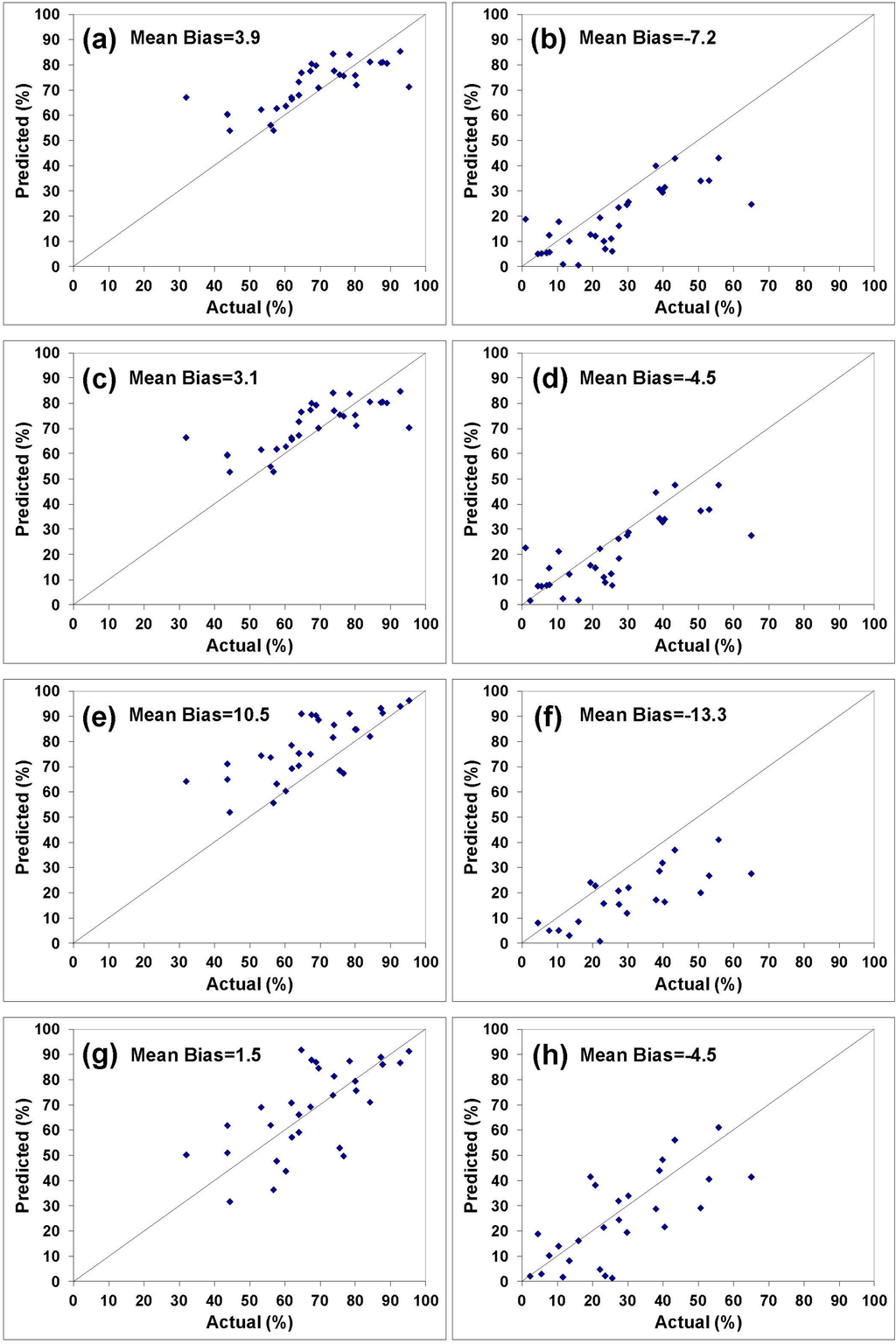 To validate the developed models, they were used to predict the percentages of stand size classes and categories of species in Chattahoochee National Forest, a data set not used in their development. The validation results are shown in Figures 8 and 9 and Tables 8 and 9. A number of measures of model prediction and error were used to illustrate the models’ overall effectiveness.