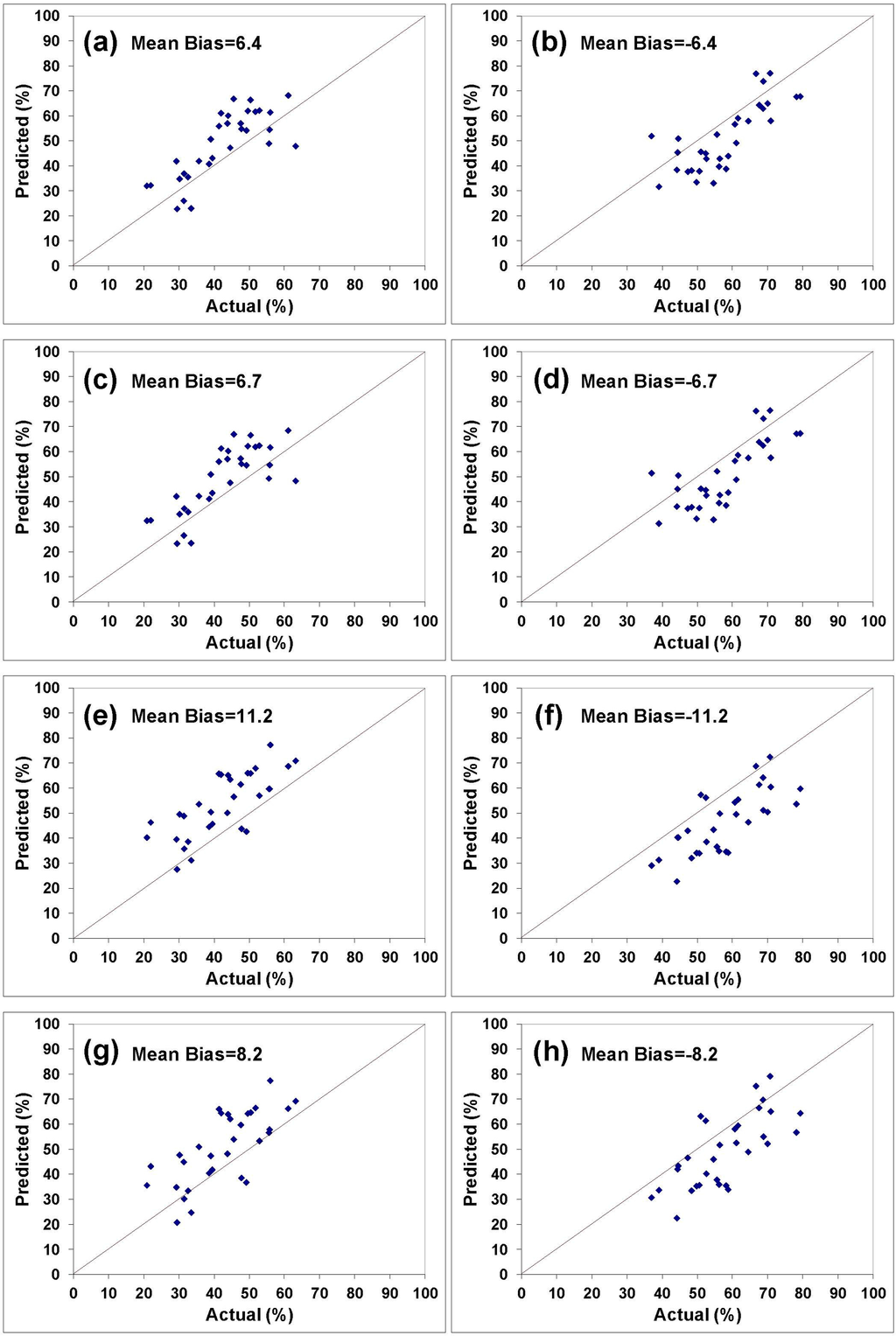 The mean absolute percentage error (MAPE), the root mean square error (RMSE), Pearson’s correlation coefficient (r), and R21:1 that measures the relationship between the predicted values and a perfect fit to the observed data (i.e., a 1:1 line through the origin) are the most commonly used statistics in the validation of satellite estimates [64]. The MAPE measures the average absolute difference between the estimated and observed values compared to the observed values. The RMSE also measures the average error magnitude but gives greater weight to the larger errors. The r measures the degree of correspondence between the estimated and observed distributions and it is independent of absolute or conditional bias; it should therefore be used along with other measures when validating satellite estimates [64].