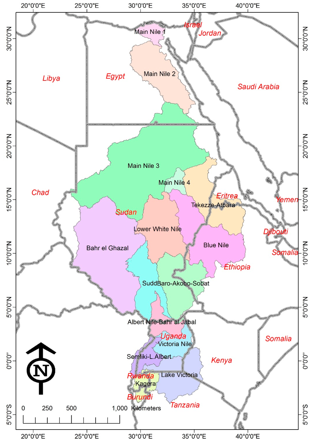 Location of sub-basins of the Nile River system delineated by the Nile Basin Initiative.