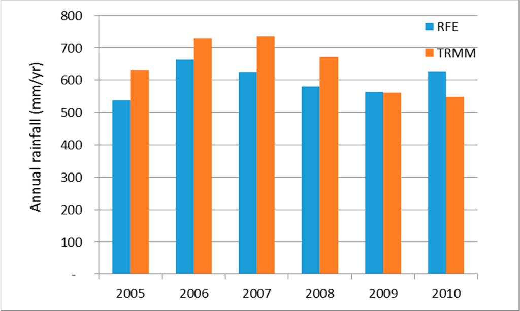 The difference in annual rainfall from TRMM and RFE is presented in Figure 2. The bar chart demonstrates that TRMM gives for most years a slightly higher rainfall over the Nile basin than RFE. The average value for the period 2006–2010 is 647 mm for TRMM and 600 mm for RFE. This is a difference of 47 mm or 8%. While this difference seems reasonable, the consequence of 8% difference at an average rainfall volume of 2013 km3 is a potential error of 161 km3/yr, which is two times the historic Nile flow at Dongola. This example demonstrates the need for a high accuracy in rainfall products. Because the official WMO rain gauge network is limited in number, and both TRMM and RFE have advantages and disadvantages, it is difficult to favor one of the rainfall products without in-depth research. For pragmatic reasons, the pixel values of the two rainfall products were linearly averaged. Ensemble rainfall products based on Earth observation data will likely lead the way forward to obtain reliable rainfall data layers. The new Climate Hazard Group IR Precipitation Station (CHIRPS) rainfall product is an example of an ensemble product based on various interpolation schemes to create spatially continuous grids from raw point data based on climatology, satellite measurements and ground precipitation observations from a variety of sources (Funk et al., []).