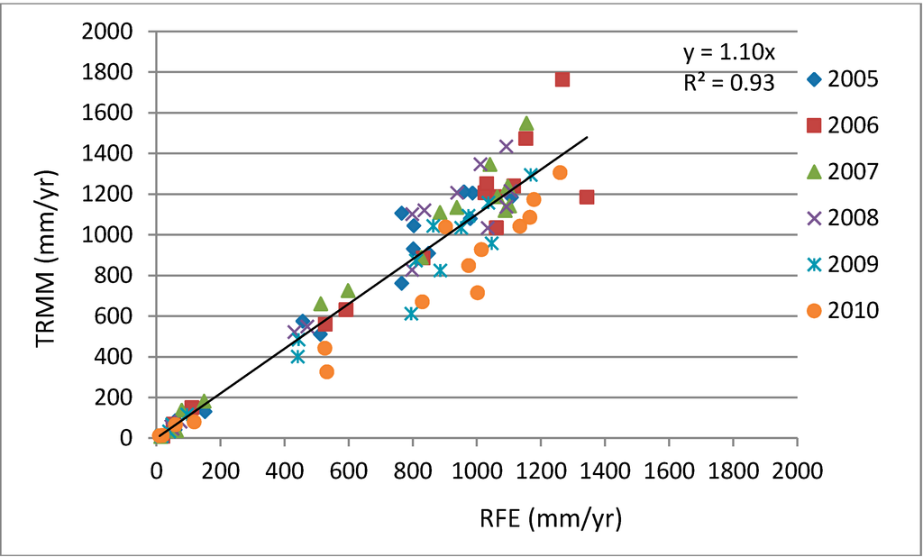 The consistency between the TRMM and RFE rainfall products for all 15 sub-basins is shown in Figure 3. The scatterplot demonstrates that the overall agreement is acceptable, but that large differences in local rainfall occur (RMSE is 153 mm/yr). The largest differences in absolute rainfall amounts occur over the equatorial Nile zone. The rainfall rates over Lake Victoria and the Victoria Nile sub-basins are frequently more than 250 mm/yr different: the difference of 250 mm/yr is unlikely. Rainfall estimates of the Blue Nile sub-basin also seem to have unreasonable differences. It is therefore concluded that more research is needed to validate local rainfall products from Earth observation data. The success of calibration will increase if the data are exposed to a downscaling procedure first. Examples of calibrating downscaled rainfall products are provided in Duan and Bastiaanssen ([]) and Hunink et al. ([]).