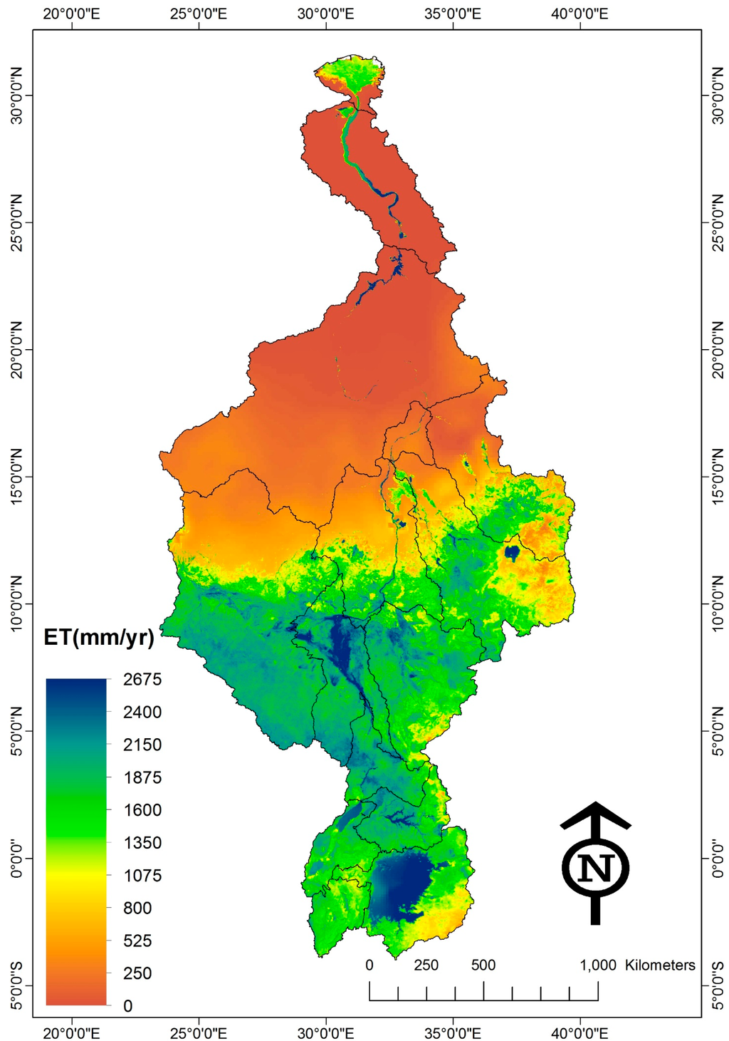 Distribution of the annually accumulated actual evapotranspiration across the Nile basin averaged for the period 2005–2010. The pixel size is 1 km. The data are based on SSEBop being calibrated against ETLook and adjusted for interception energy.