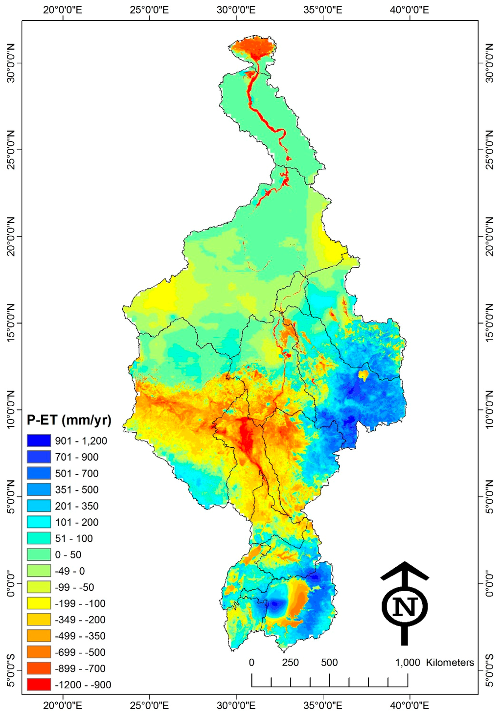 Water production areas (P > ET) and net water consumption areas (ET > P) for the Nile basin over the period 2005–2010. Lateral transport of water occurs from positive to negative areas, also non-conventionally via floods and groundwater flow