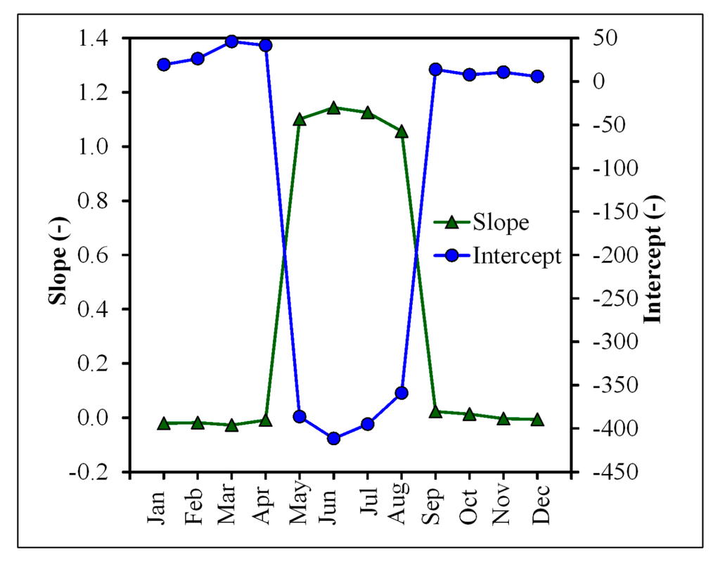 6.1. Monthly Evapotranspiration Using the Regression (Slope-Intercept) Method