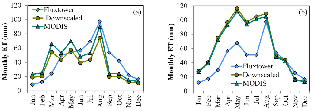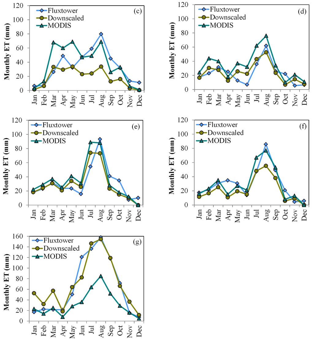 6.3. Comparison of Downscaled Monthly AET Maps with the Eddy Covariance Measurements