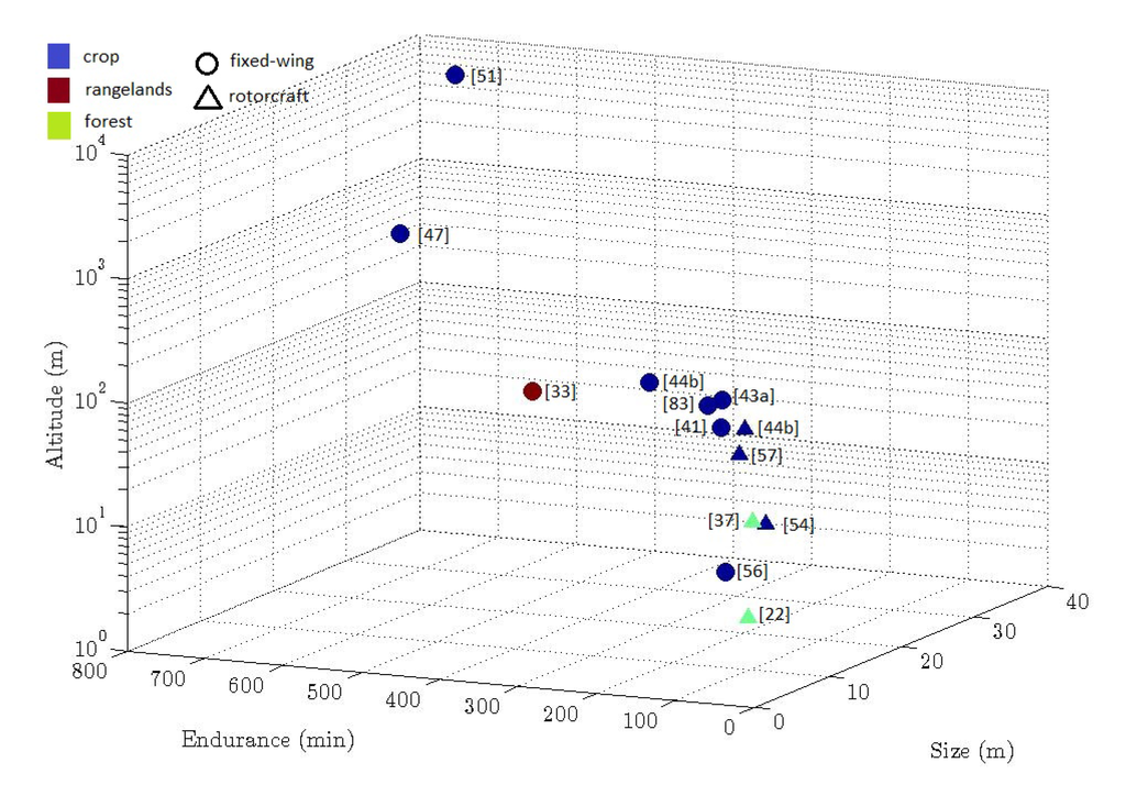 A global view of the most significant characteristics of some of the UAV experimental flights is shown in Figure 1. Colors show the type of vegetation: blue is for crops, green is for forests, and red for rangelands. Markers show the type of airframe: circle is fixed-wing and triangle is rotorcraft. Then flight altitude, experiment flight time and platform size are given in the three axis. Notice that altitude is in logarithmic scale to better distinguish between low altitude flights. Not all experiments are shown because not all the data required for the plot were available. Nevertheless, the figure gives an global idea of the experiments and their characteristics.