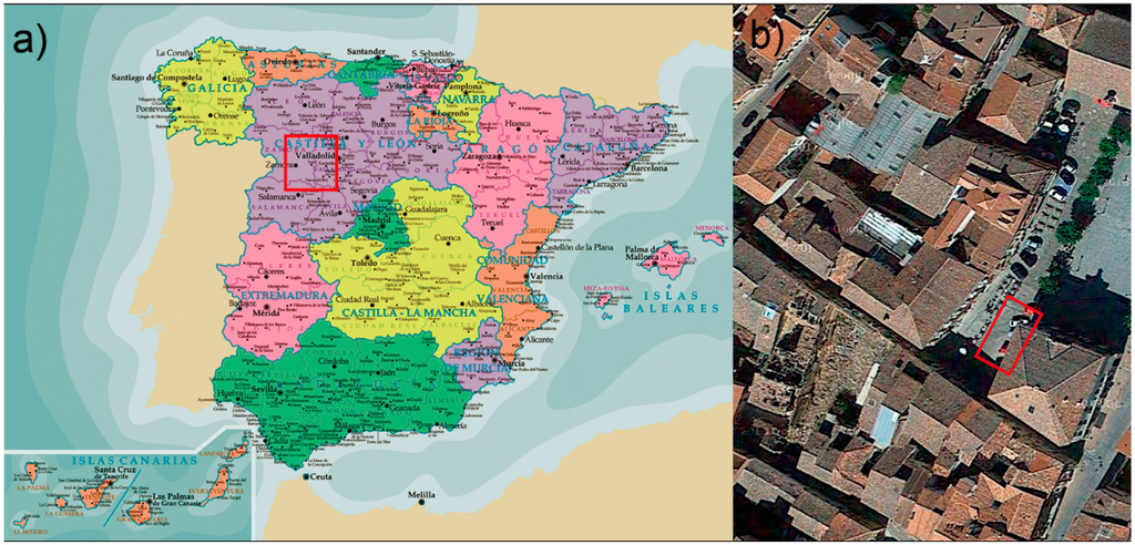 (a) Location of the wine cellar: Toro, Zamora, Spain; (b) top view and location of the “Toro’s Council” wine cellar.
