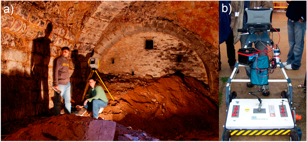 The conjunctions of TLS and GPR provide us a whole metric 3D structure of the external and internal areas inside the wine cellars. In particular, GPR geophysical methods enable the identification of the size, shape and direction of inaccessible areas, such as walled, hidden areas or areas where there have been landslides. Multidisciplinary approaches have been applied for the documentation of historic structures, as is the case of: [], who applied GPR and photogrammetric techniques to document megalithic tombs; and [,], who applied digital photogrammetry and GPR, to evaluate structural damages and possible failures of a mediaeval bridge. Recently a combination of GPR and electrical resistivity tomography (ERT) techniques has been applied to reveal hidden archaeological structures in a mausoleum [] and in the Acropolis to reveal a bronze foundry complex []. On the other hand, in the context of geology and not for archaeological and heritage documentation, [] used a combination of geomatics and geophysical methodologies for geomorphology characterization of a small mountainous catchment in Scotland. Specifically, they used a TLS (Riegl LPM-i800HA) to create a detailed digital terrain model (DTM) and the Differential Global Positioning System (DGPS) to complement the other geophysical techniques. In a similar way, [] used TLS data in combination with GPR and ERT to evaluate the stability of cliff sites; more recently, [] employed a multidisciplinary approach based on GPR, ERT and TLS to investigate the responses of slope stability due to climatic changes in high alpine rock walls.