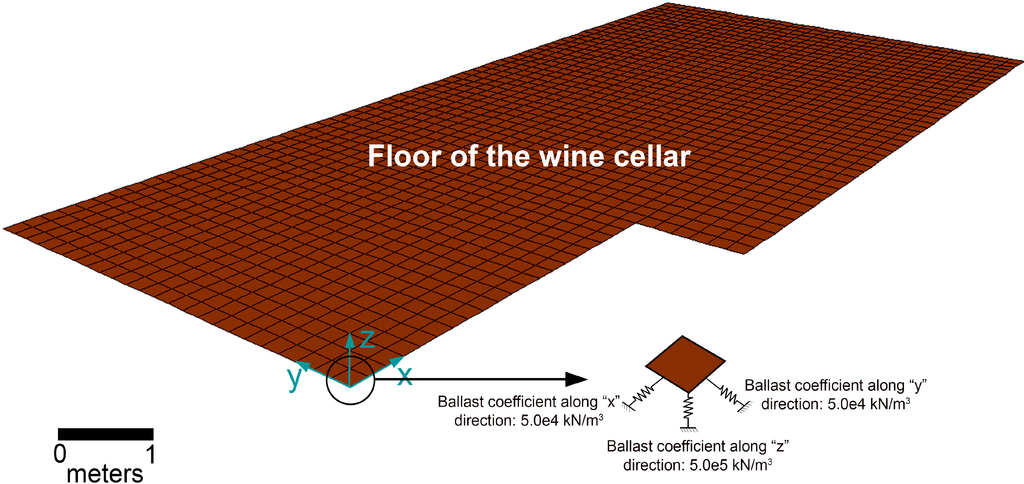 More specifically, these supports are modeled through the area elements of the ground of the winery with a ballast coefficient estimated as 5 × 105 kN/m3 in the vertical direction according to [,]. This is a high value because of being a consolidated soil for years. A ballast coefficient in both horizontal directions was used to compensate for the asymmetry of loads. The ballast coefficient for horizontal loads was equivalent to a tenth of the vertical one. Figure 3 shows the floor model of the wine cellar with the boundary conditions imposed at one of the shell elements; the same boundary conditions are applied to the rest of shell elements.