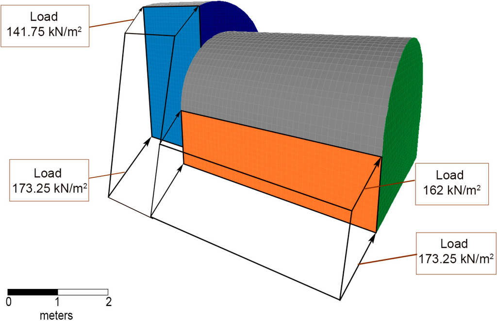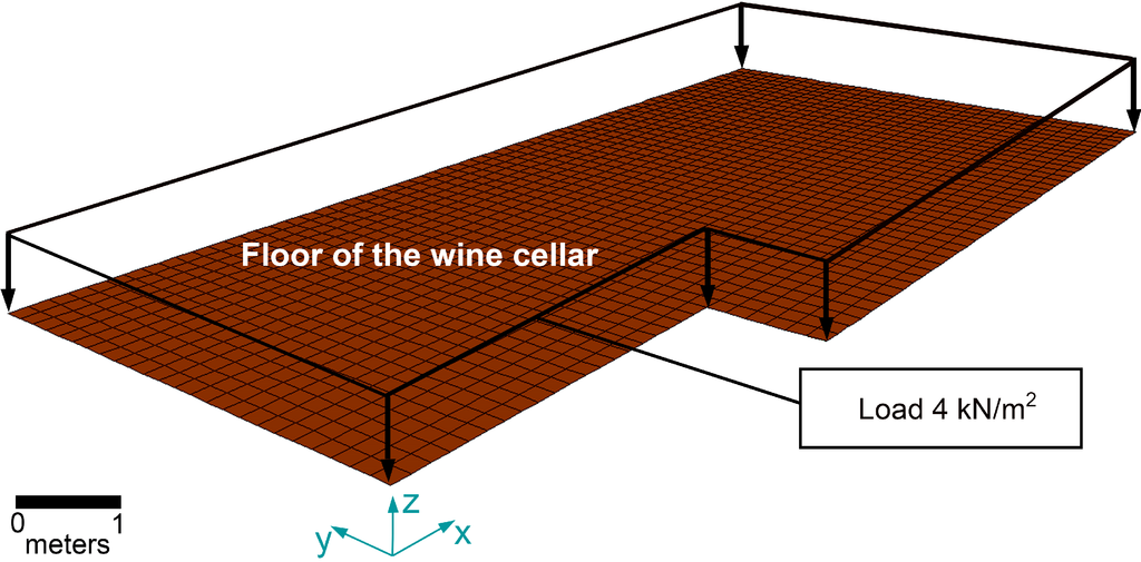 - Live loads (LL) are those loads due to the presence of people inside the cellar and the building; values were taken from []. This load includes a service overload of 3 kN/m2 in the upper building (Sb Building use) and a service overload of 4 kN/m2 in the cellar (Sc Cellar use). Following the same procedure explained above, the new live loads on the vault of the cellar were estimated. The service load of 4 kN/m2 was introduced as a uniformly distributed load (Figure 6)