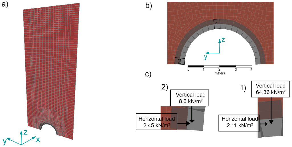 - The data considered for the soil were: specific weight of 18 kN/m3, modulus of elasticity (E) of 8 × 104 kN/m2 and an internal angle of friction of 30°, according to []. Historic documents relate that the height of soil over the vault is 19 m. The model of the vault and the soil consists of a 1 m-thick flat model (Figure 5a). The vault was modeled through 30 discrete bar-type elements, with a length of 25 cm each and a cross-section defined by a thickness of 40 cm and a width of 10 cm.
