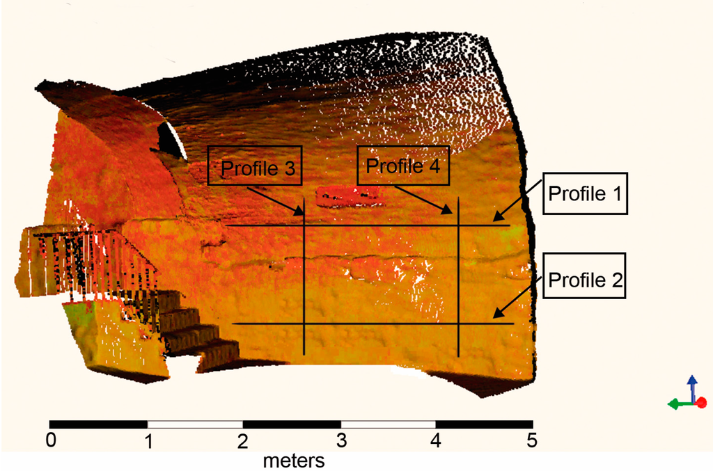 The external and internal geometry of the wine cellar was acquired from a combination of TLS and GPR [], respectively. More precisely, it was necessary to scan at four laser stations. Each scan provides a horizontal coverage of 360° acquiring a point cloud with an average of 1-cm resolution at 10 m and using two single shots per point. The data collection settings ensured more than 50% overlap between clouds of points, guarantying the best alignment. In this way, we obtained a total of approximately eight million raw points in XYZ coordinates for the geometric definition of the interior of the wine cellars. Regarding the internal geometry, four profiles were defined with enough length to distinguish the reflections correctly. The standard procedure is performing horizontal profiles (in a plane orthogonal to the plumb line). However, with walls of reduced width, it was necessary to acquire vertical profiles. In addition, radar profiles were geo-referenced based on geometric data collected by TLS, which constituted a significant advantage towards the success of profile interpretation (Figure 7).