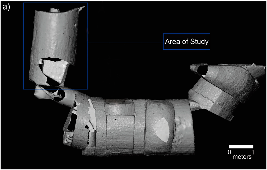 The structural analysis was focused in the zone of the wine cellar shown in Figure 8a, which presents the 3D model of the whole cellar. The reason for choosing this part of the winery was motivated by the results found in the GPR campaign, which showed important information about the internal composition of the walls. In this zone, the interpretation showed the existence of materials of low compactness and high porosity, as well as the presence of air voids (red color) behind some of the wine cellar walls (Figure 8b). Figure 9 shows the FEM model of the cellar from laser data.