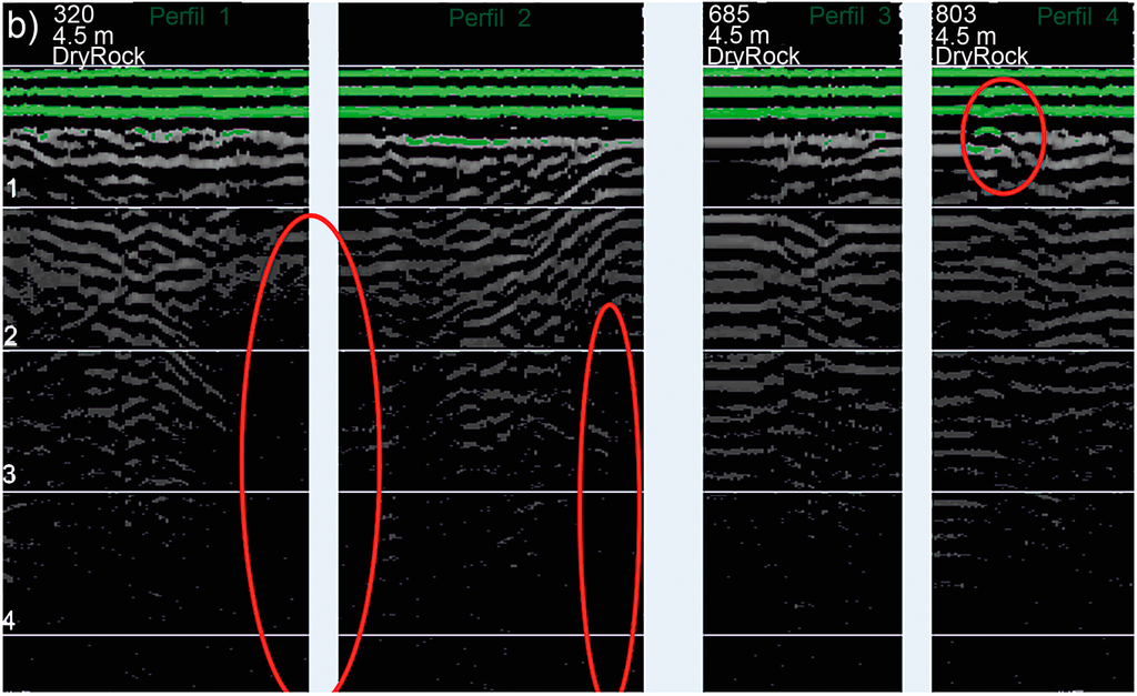 On the other hand, two additional profiles were surveyed and considered as a reference. These reference profiles consist of registering data (TLS and GPR) at locations in which the composition of what exists underground was previously known. The in situ procedure consisted of using the walls whose faces are visible following the procedure presented in []. The external geometric model was achieved using the TLS, whereas the morphologic composition of the wall was deducted from the visible walls. Then, a georeferenced grid (at both of the wall faces), using flat reflective targets, marked the path of the antennas during the calibration, and so, this combined information assisted the calibration model and, thus, the registration of TLS and GPR under the same coordinate system. In this way, a first reference profile was surveyed in a wall with a known hole behind; a second reference profile was surveyed in a wall where the composition of material behind was known (conglomerate in a reddish brown clay matrix, corresponding to “Toro’s Red Facies”).