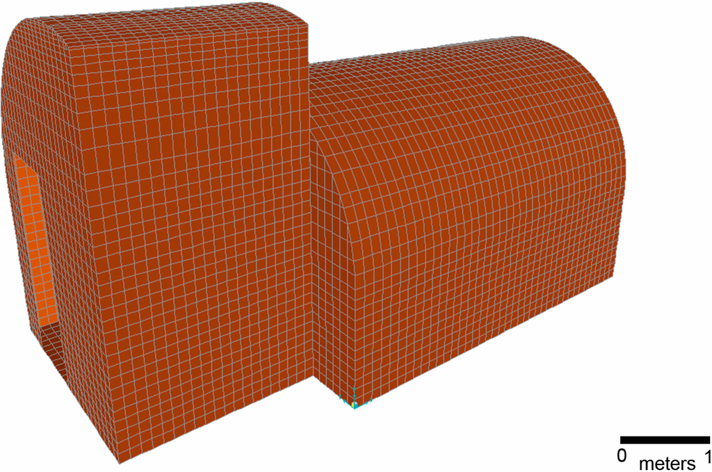 In continuum model approaches, the walls are assumed to be composed of a single material whose mechanical behavior is described by a non-linear constitutive law [] or the different mechanical behavior between stone and mortar and the anisotropy induced by them are taken into account on the basis of a homogenization theory []. For the computational modelling of the wine cellar presented here, a continuum model was used. In particular, a 3D FEM based on the overall geometry taken from TLS was considered, whereas the GPR survey gave important general information about the internal composition of the wine cellar walls. As a result, on site measurements could be applied to make the computer simulation more reliable.