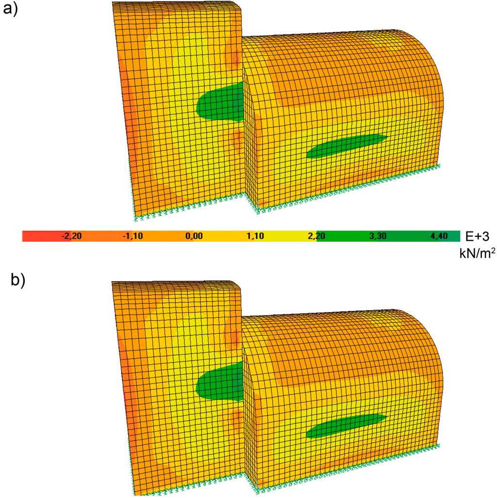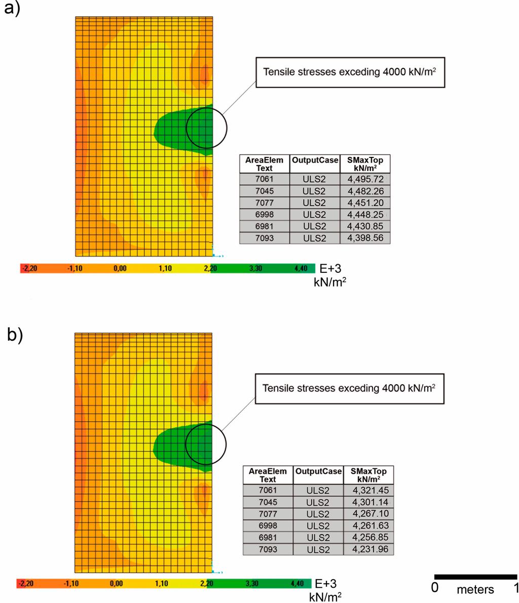 (a) Maximum principal tensile (kN/m2) for the elevation wall with a thickness of 0.38 m; (b) maximum principal tensile (kN/m2) for the elevation wall with a thickness of 0.42 m.