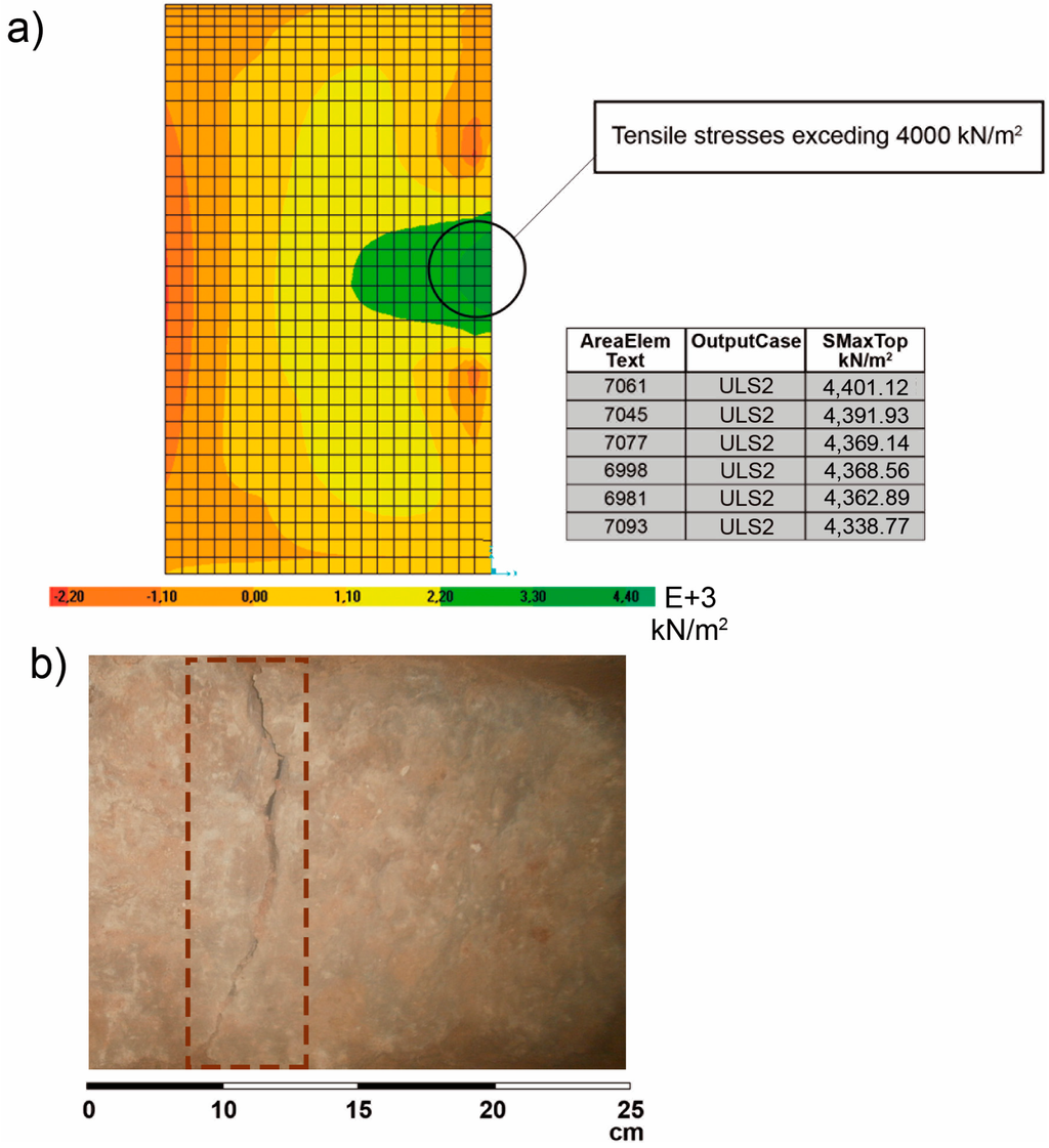 It can be appreciated that the principal tensile and compressive stresses are slightly higher in the ULS1 (Figure 10a) than in the ULS2 (Figure 10b). In the ULS1, higher compressive stresses occur in the vault with values of 2 × 103 kN/m2, which do not exceed the compressive strength of limestone, which is 4 × 104 kN/m2 (obtained in Section 2.2.1). Consequently, it can be assumed that cracking in the vault will not occur. On the other hand, the highest values of tensile stresses would be found at the walls of the wine cellar due to the tensile stresses that the bending moments would cause on the walls of the cellar, provoked by soil pressure. Figure 11a shows a small area where values near 4000 kN/m2can be found. These values would mean that the tensile fracture point of the limestone has been exceeded. It is expected that the masonry might crack in that area, so a visual inspection of the site was conducted checking for the cracking of masonry in that area. The region of maximum tensile stresses is confined in a very specific area in the cellar, but after the visual inspection, a pattern of fissures in the walls could not be observed. Only an isolated masonry block presented a vertical fissure (Figure 11b).