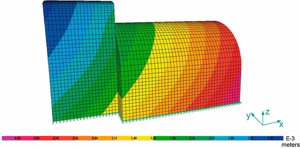 The second part of the analysis is a study of the deformations [,] in order to identify areas of excessive deformations that could jeopardize the functionality of the building. Figure 13 shows the greatest deformations along the Y-axis of the SLS1 model. The deformations are in the order of millimeters, the highest value being 3.36 mm. It is observed that these are small values, and this is largely due to the underground confinement of the cellar, which prevents large deformations and does not put at risk its functionality.