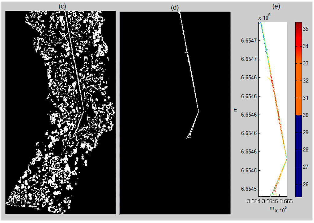 The entire process from the original ALS data to the power line is illustrated in Figure 4a–e. The data were one of the six test datasets: Area 4. Figure 4a is the original ALS point cloud with a density of 55 points/m2. Figure 4b is the power line candidates. It can be observed that after statistical analysis, the power lines became more visible. Moreover, as the number of points was considerably reduced, the subsequent processing became more efficient. Figure 4c is a binary image that was transferred from Figure 4b. After the image was filtered by the area size, length and shape, the result yielded Figure 4d: a power line image. This 2D power line image was transferred to 3D power lines (see Figure 4e) using the same parameters as in Figure 4b to Figure 4c. Figure 5 shows another example of the power line extraction in Area 5. It can be observed that the shape of the power lines is different from that in Figure 4. By applying image processing technology, the power lines were distinguished from their surroundings. This figure also illustrates the entire process. The explanation is the same as that presented for Figure 4.