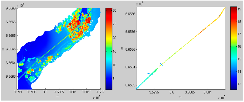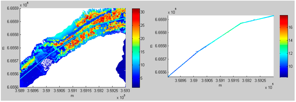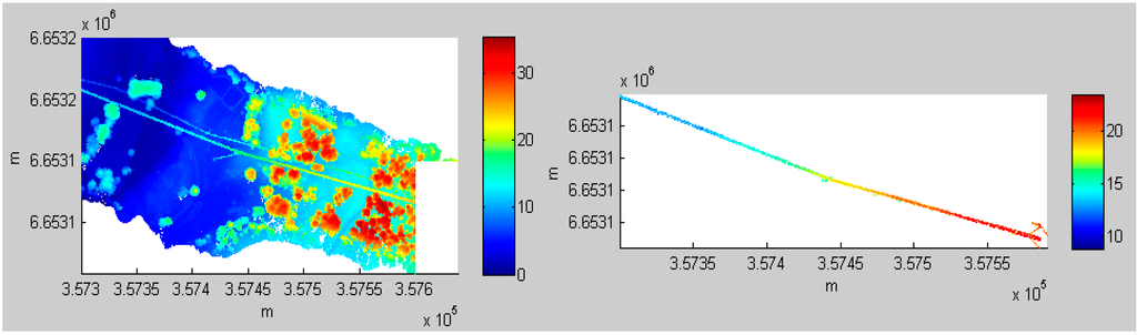 The parameter settings and quantitative results for the test datasets are presented in Table 3. The parameters include sizeP, Pdensity, paraArea_min, paraArea_max, paraLength and paraShape. The descriptions of the parameters can be found in Table 1. The parameter values vary according to the different power line shapes, the continuities of the power lines and the closeness between the power lines and trees. For example, the image pixel size is usually determined by the noise level around the power lines. When trees are very close to the power lines, a small pixel size should be applied. However, due to a consistent point density in the test datasets, the parameter “Pdensity” was set to the same value for all datasets. In a binary image, each separated region is called a region. The area of a region can be counted as the number of pixels. When the pixel size of an image is small, e.g., sizeP = 0.5, the area of the region is 20 (pixels); whereas when sizeP = 1, the area of the region is 10 (pixels). Therefore, we say paraArea_min and paraArea_max are not independent. This depends on the pixel size of the image. When “sizeP” changes, not only “paraArea_min” and “paraArea_max”, but also “paraLength” must also be adjusted. “paraShape” determines the shape of the objects that are to be detected. When power lines are line-like, “paraShape” is close to one. For example, Figure 9 shows power lines that are nearly straight lines (paraShape = 0.99), while Figure 5 shows power lines that change direction (paraShape = 0.93).