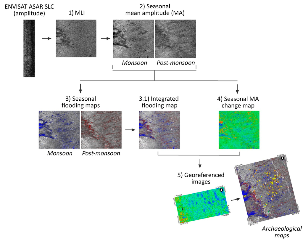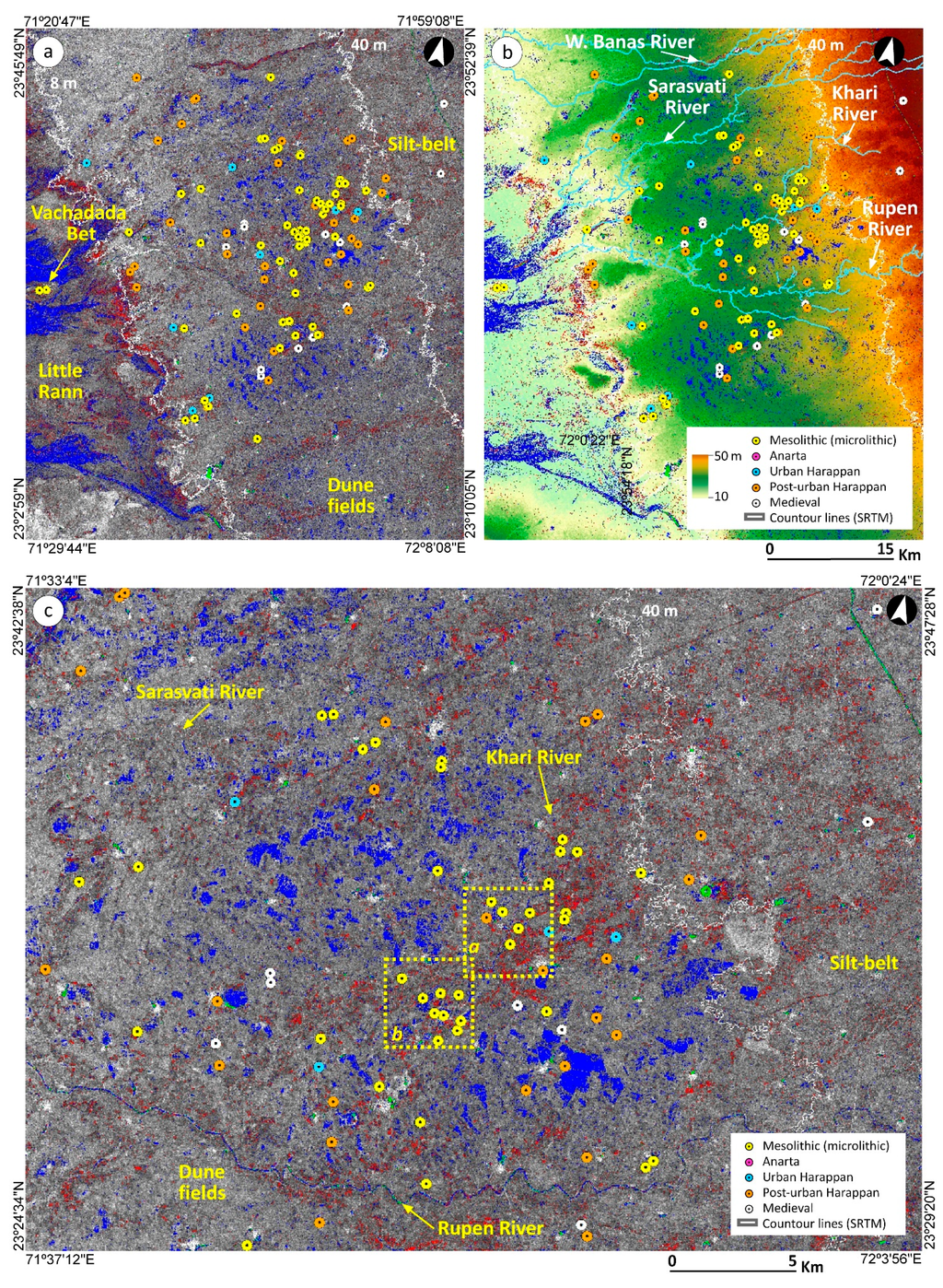 The amplitude seasonal flooding maps, elaborated for this work through the processing of radar images, allowed the identification of active morphogenic processes affecting pedological conditions and water distribution in the semi-arid region of North Gujarat. The alluvial plains located between the coastal marshes areas of the Little Rann of Katchchh and the Western Cambay Basin Margin Fault boundary (along the 40 m a.s.l. contour line) are characterized by well-preserved sand dunes that remain dry throughout the year, and seasonally flooded interdune areas. The main watercourses of the study area discharge into the Little Rann and show well-defined palaeochannels and frequent avulsion episodes. Although the main discharge of these rivers happens during the onset of the Indian Summer Monsoon (June to September), amplitude response in the post-monsoonal months (October to January) suggests abundant water retention in the near-river water table. These seasonal dynamics of water discharge have most probably influenced the prehistoric and historical patterns of landscape exploitation by human groups with diverse economic strategies (hunter-gatherers, agro-pastoralists and farmers). Indeed, the integration of archaeological evidence with SAR amplitude images shows that human occupation was recurrent on raised dunes located close to areas with higher water retention, which represent potential resources hotspots through the post-monsoonal months (e.g., interdunes, lakes, and river banks).