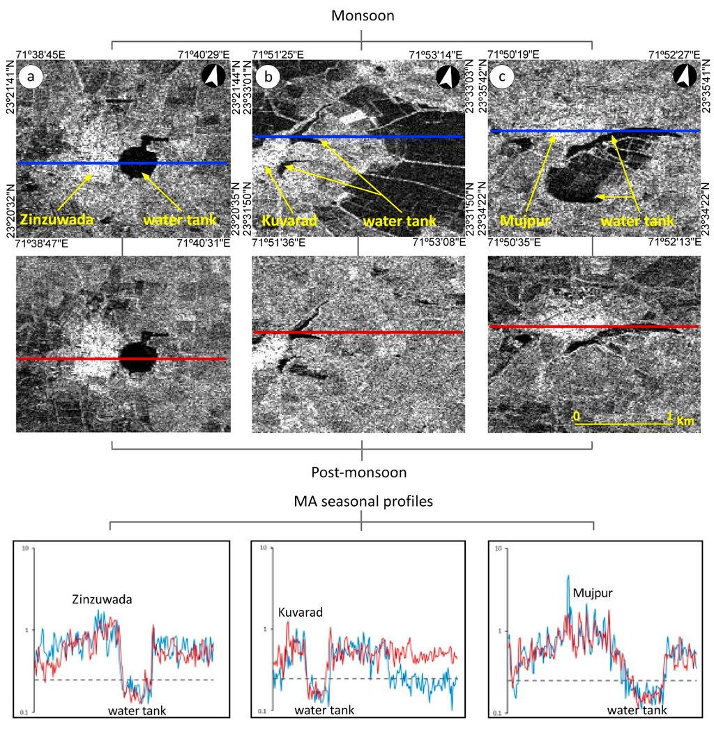 Land use change, the construction of dams in the 60s and the presence of large irrigation canals has substantially altered the nature and frequency of flooding discharge and run-off in N. Gujarat. In addition, observed changes in the water flow and the high variability of seasonal water-bodies might be also a partial result of post-monsoonal tube-well irrigation, which is a well-distributed activity hard to detect by the medium resolution provided by C-band imagery.