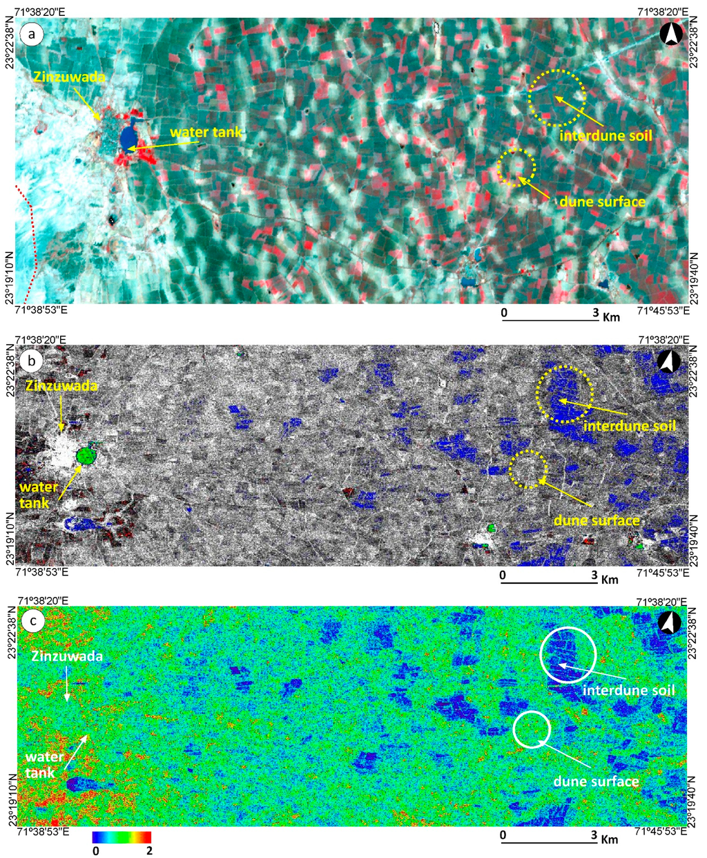 Figure 8c displays the MA ratio between monsoonal and post-monsoonal MA values. A good correlation between values with small season variability can be related to permanent anthropic features in the landscape (i.e., Zinzawada village and its water tank). On the other hand, the ratio of interdune fields reflects flood-prone areas that could retain soil moisture during the post-monsoonal period, whereas MA change values for fossilized dunes indicates a surface stability (i.e., non-floodable areas) between seasons.