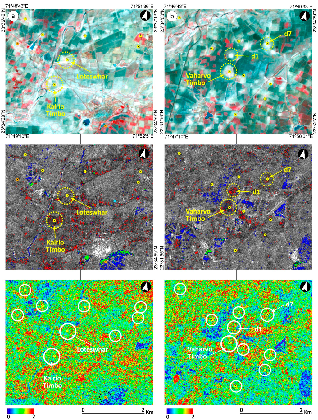 Subset detail of two archaeological areas within the Khari River basin area: (a) Loteshwar/Kalrio Timbo and (b) Vaharvo Timbo. Image composition shows, in descending order: orthorectified ASTER false colour composite (3N-2-1) from 1 October 2004; integrated seasonal flooding maps (blue for monsoon, red for post-monsoon and green for no change) superimposed to MA images; and seasonal MA change map (stretched histogram).