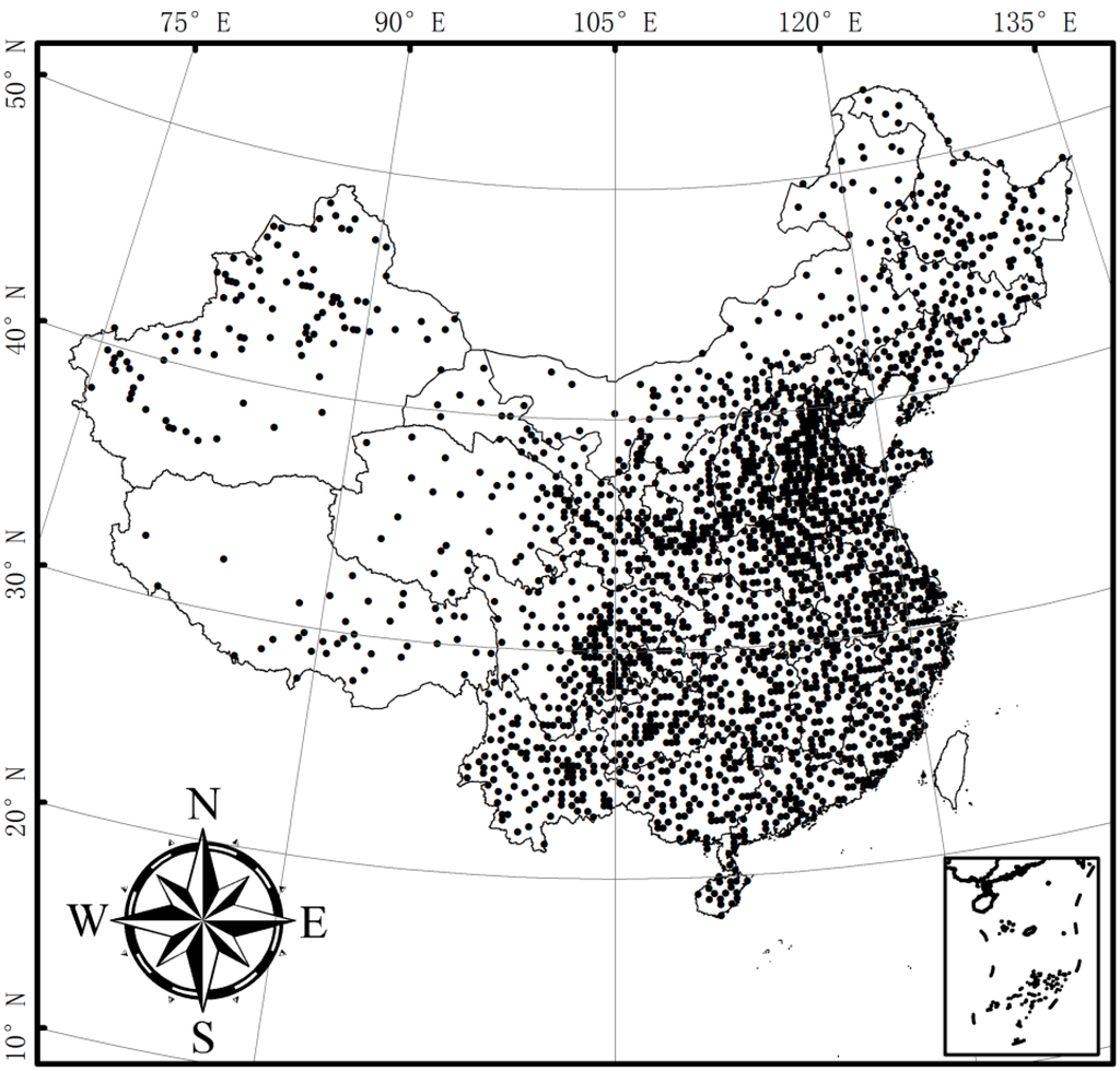 A gauge-based daily rainfall analysis (China Meteorological Administration gauge-based rainfall analysis, CMA-GRA) was used as a reference dataset to evaluate the satellite-based precipitation products [43]. CMA-GRA was built based on a high-density gauge network that consists of more than 2000 automatic weather stations (Figure 1). An objective technique was used to define CMA-GRA [35,50,51]. CMA-GRA had been used previously in Shen et al.’s work [43].
