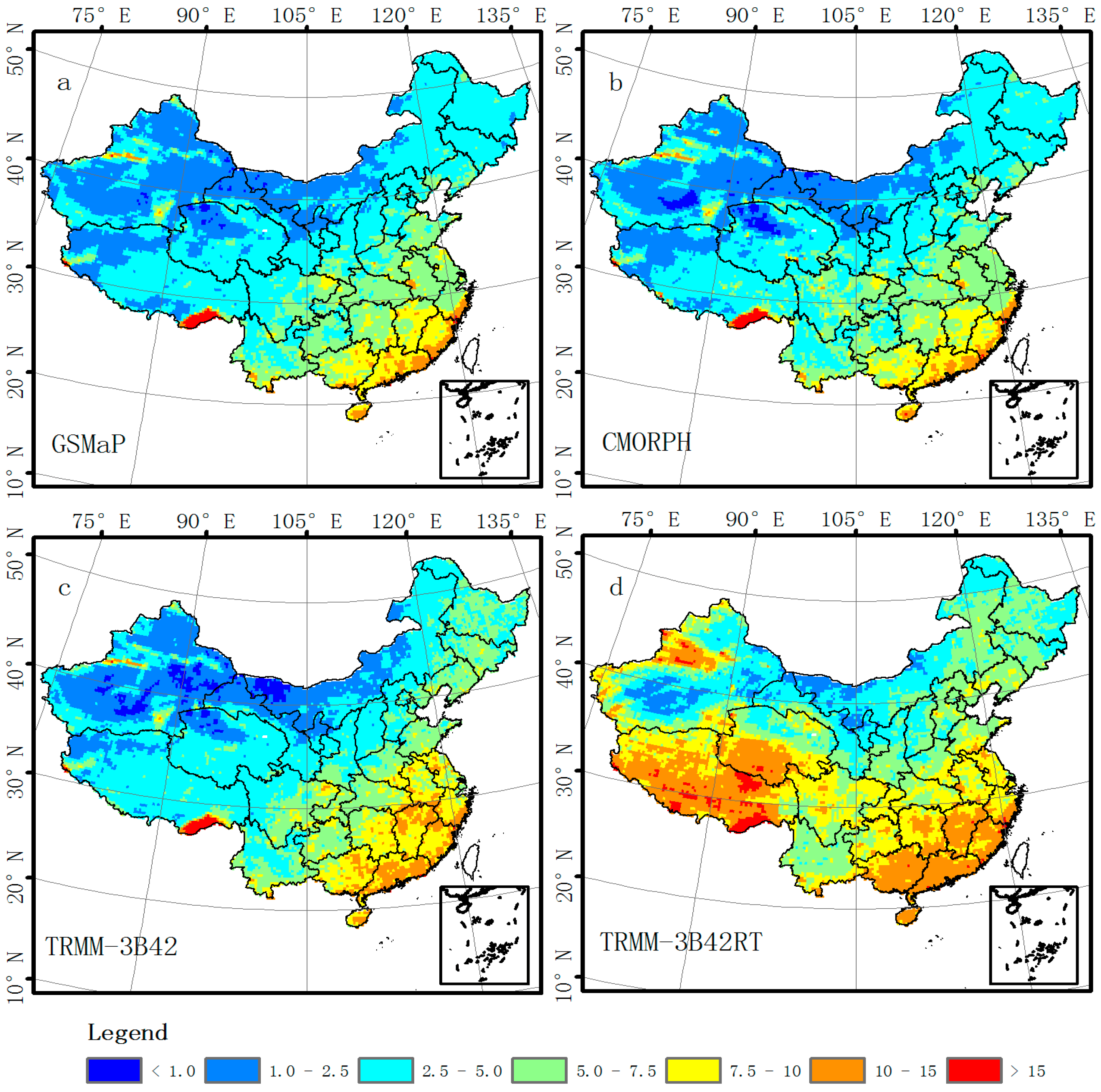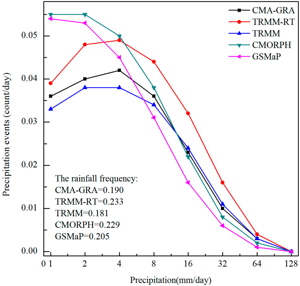 Figure 2 shows the intensity distribution of precipitation events count from each of the four dataset. All grid cells, which contained at least one gauge, were used to count precipitation events from 2003 to 2006 over the Chinese Mainland. The numbers showed in the lower-left corner of Figure 2, such as 0.190 for CMA-GRA, are ratios between rainfall events and total events (both rainfall events and no rainfall events) for every precipitation products. The intensity distributions of the daily number of precipitation events or histograms enable one to better observe the errors at different rainfall rates. Almost all satellite-based precipitation products (GSMaP, CMORPH and TRMM-3B42RT), with the exception of TRMM-3B42, had about 20%–50% more events than CMA-GRA across the range of 1–8 mm/day (low-intensity rainfall events) (Figure 2). TRMM-3B42 had about 10% fewer events than CMA-GRM across the range of 1–8 mm/day. The histograms of TRMM-3B42 and CMORPH align well with CMA-GRA in the range of 8–128 mm/day. TRMM-3B42RT overestimated the number of rainfall events across the range of 8–128 mm/day, whereas GSMaP had the fewest events among all the datasets across this range. In addition, Figure 2 depicts CMORPH and GSMaP had the most rainfall events when precipitation amount no more than 2 mm/day. However, reference data (CMA-GRA) and TRMM products had the most precipitation events across the range of 2–4 mm/day. We speculate that the discrepancies at the lower tail of the distributions are related to different algorithms used by different datasets. CMORPH and GSMaP employed morphing technique, which propagates PMW precipitation estimation by using cloud motion vectors derived from IR data, may cause more appearance of low intensity precipitation events.