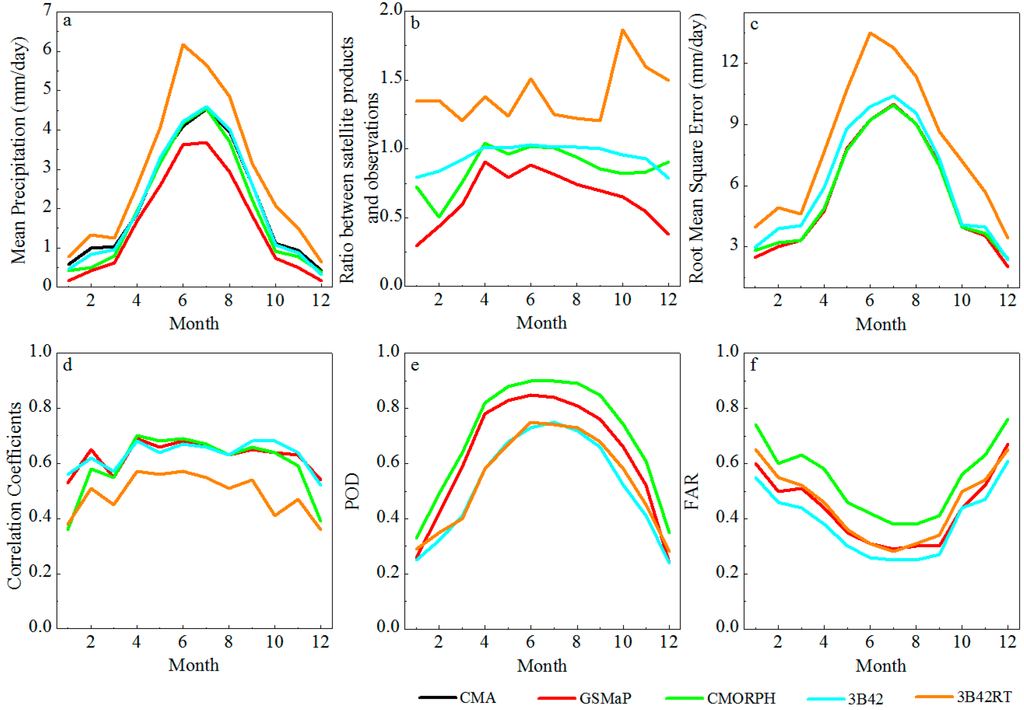 3. All satellite-based precipitation products performed well in capturing seasonal variability in precipitation. GSMaP underestimated precipitation all year round. Mean daily precipitation of the CMORPH and TRMM-3B42 generally agreed with the CMA-GRA. The TRMM-3B42RT dataset significantly overestimated precipitation each month. CC, POD and FAR indicate that satellite-based precipitation products performed better in summer than winter.