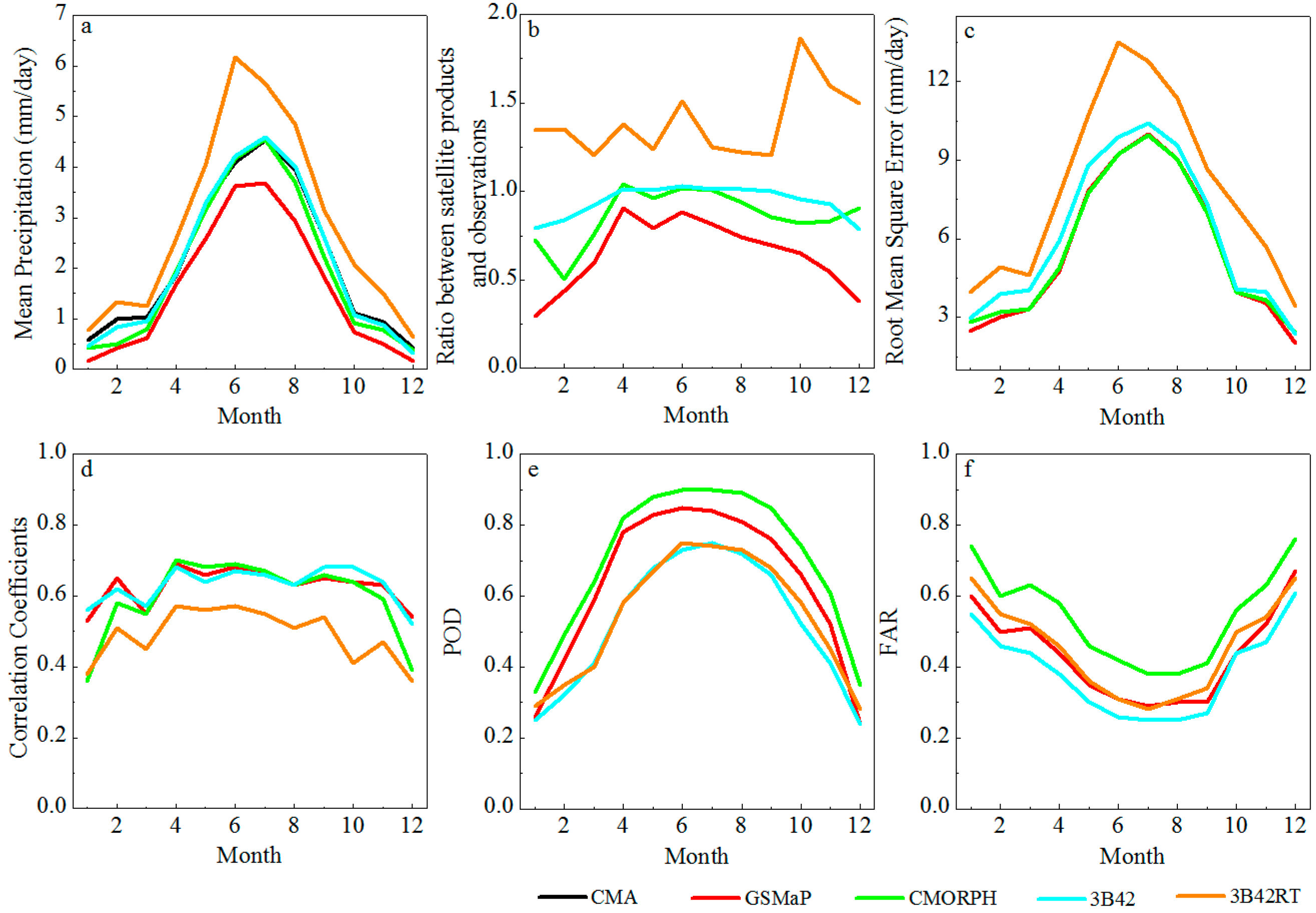 Seasonal variations of validation statistics. (a) Mean precipitation (mm/day); (b) ratio between satellite products and observations (%); (c) RMSE (mm/day); (d) Correlation coefficients; (e) POD and (f) FAR.