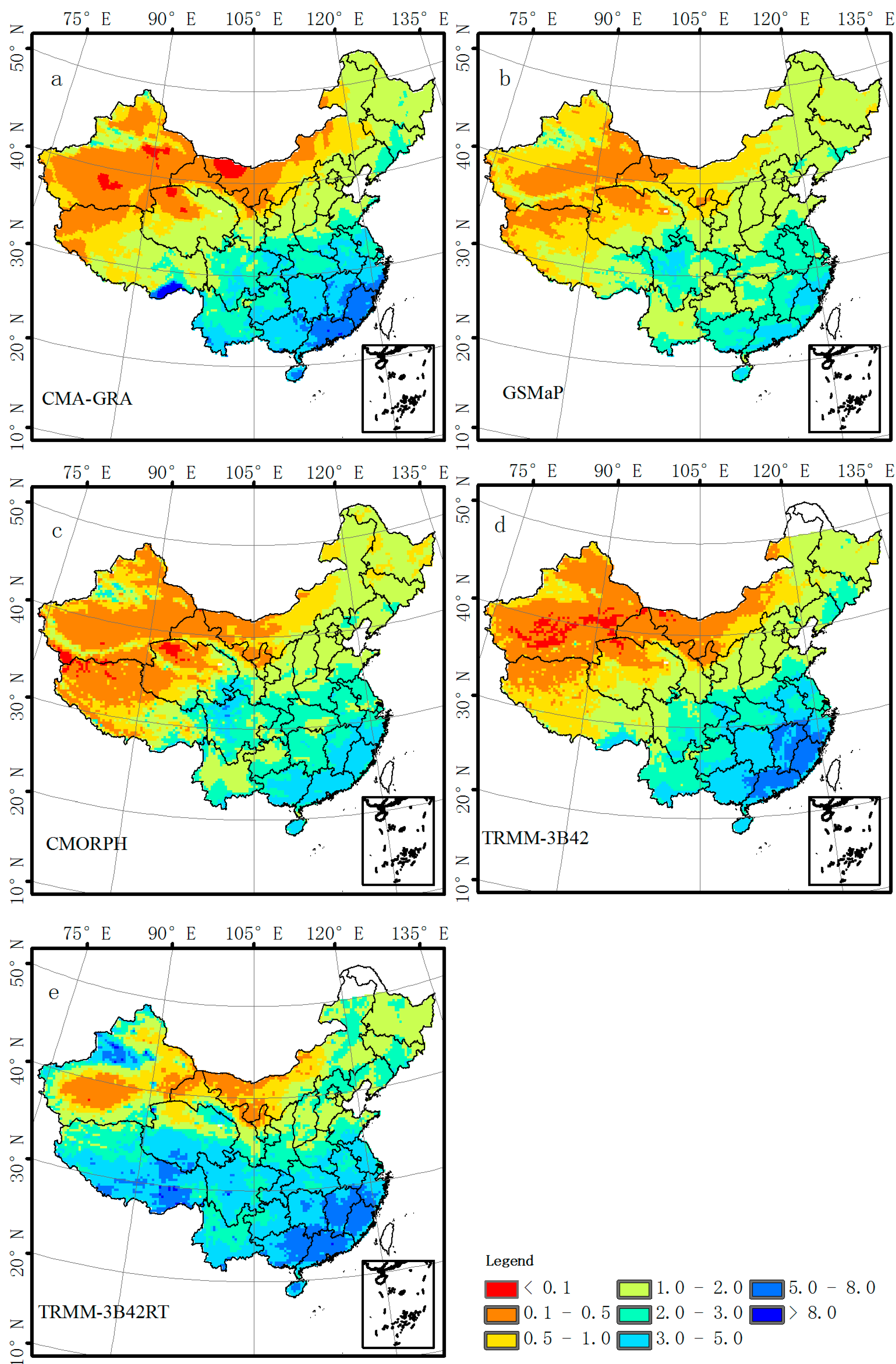 Distribution of daily mean precipitation over the Chinese Mainland from 2003 to 2006. Units are mm/day. (a) CMA, (b) GSMaP, (c) CMORPH, (d) TRMM 3B42 and (e) TRMM 3B42RT.