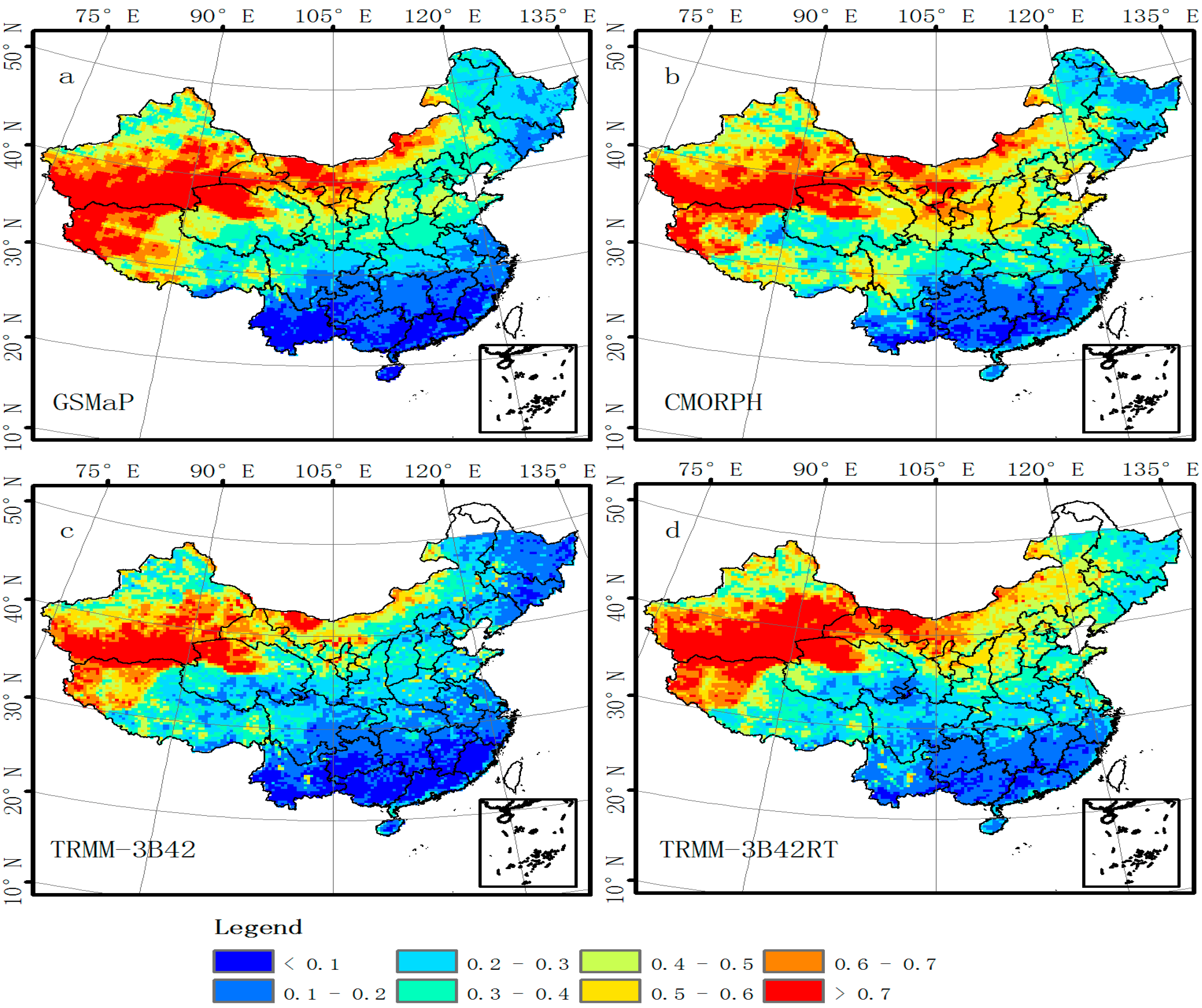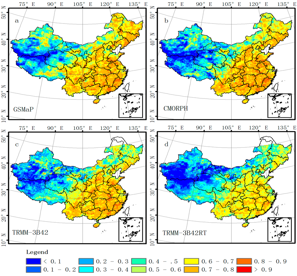 Figure 6 shows the spatial distribution of the four years mean precipitation based on daily gauge analysis and the satellite-based precipitation products. The precipitation distribution over Mainland China was characterized by a southeast-to-northwest decrease in the mean intensity of daily gauge-based analysis data. All satellite-based precipitation products depicted this spatial pattern. However, there was an obvious underestimation over southern and southeastern portions of China by GSMaP and CMORPH, where landfall of typhoons and annual migration of the monsoon (Mei-Yu) introduces abundant fresh water. The heavy rainfall may cause signal attenuation of PWM sensor, which may cause underestimation in satellite-based precipitation products. AghaKouchak and Mehran [44,58] also found that satellite-based precipitation products lose their accuracy as precipitation threshold increases over continues of United States. GSMaP and CMORPH tended to underestimate the annual precipitation by about 1–3 mm/day in these regions. The overestimation is detected in TRMM-3B42RT and GSMaP over arid and semiarid inland regions in the northwestern of China. Many other studies also detected that satellite-based precipitation estimates trend to overestimate precipitation in arid and semiarid regions [37,40]. A possible explanation for these overestimations is that raindrops may evaporate before reaching the surface [63]. Therefore, satellite-based precipitation estimates led to overestimation in arid and semiarid regions, but underestimated precipitation in humid regions over the Chinese Mainland. Sorooshian et al. [59] also emphasized that error characteristics of satellite-based precipitation estimates should be investigated in detail over different climate regions. Due to the gauge correction, TRMM-3B42 exhibited close alignment with CMA-GRA over the Chinese Mainland. Figure 7 illustrates the spatial distribution of RMSE between CMA-GRA and satellite-based precipitation estimates. All datasets had similar distribution of RMSE. A large (small) RMSE associated with high (low) intensity of precipitation appeared in southeastern (northwestern) China. AghaKouchak et al. [62] also highlighted that the systematic biases of satellite precipitation were proportional to the rain rate magnitude. Compared to other three precipitation datasets, TRMM-3B42RT had a large RMSE over the Qinghai-Tibet Plateau. Figure 8 shows the spatial distribution of CC between CMA-GRA and satellite-based precipitation products. The CCs of all products are good over most regions of China. Serial correlation coefficient reached 0.7 or higher over southeastern China, and less than 0.2 over most region of northwest. Values of POD and FAR are shown in Figure 9 and Figure 10. PODs of satellite-based precipitation products ranged from 0.5 to 0.9 over the Chinese mainland. The highest POD reached 90% in the center of the Chinese mainland; FAR ranged from 0.1 to 0.7 with the lowest reaching less than 10% in southeastern China. The worst POD and FAR values were detected over western of China. These results confirmed conclusion draw by Nasrollahi et al. and AghaKouchak et al. [61,62] Both of these two studies indicated high systematic and FAR value could be related to altitude effect in mountain regions.