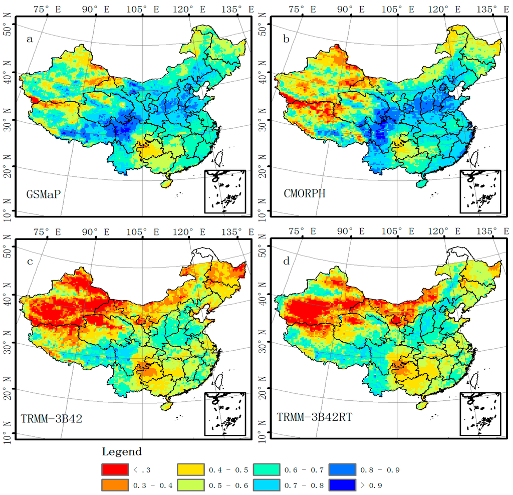 In this section, CMA-GRA was used to evaluate daily satellite-based precipitation products over the Chinese Mainland for each 0.25 ° × 0.25° grid cell that contained at least one rain gauge from 2003 to 2006. These stations are shown in Figure 1. Table 3 presents the validation results. MEs indicated that GSMaP and CMORPH underestimated precipitation by about 0.53 mm/day and 0.14 mm/day, respectively. The underestimation of satellite-based precipitation product was also detected by other research [5,31,42,56]. In fact, underestimation of precipitation is a challenge faced by most satellite-based precipitation products [31]. For example, GSMaP product has underestimated precipitation by about 2.3 mm/day in Colombia [34]. TRMM-3B42RT, however, overestimated precipitation by about 0.73 mm/day. TRMM-3B42RT has been proved that overestimated precipitation over other regions of world [1,8,34]. Behrangi et al. suggested TRMM-3B42RT had 34.5% BIAS [8]. ME of TRMM-3B42 was only −0.02 mm/day. It exhibited close alignment with CMA-GRA. Due to the correction process against monthly observations, the bias of TRMM-3B42 showed a marked improvement over the TRMM-3B42RT and had better correspondence with measurements compared with other satellite-based precipitation products. TRMM-3B42 was consistent with gauge measurements over other regions [36,40]. RMSE illustrates the degree of estimates deviating from the gauges. RMSEs of all satellite products ranged from 6 to 7 mm/day with the exception of TRMM-3B42RT. RMSE of TRMM-3B42RT was about 8.6 mm/day. The CC measures the degree of linear association between the estimated and observed distributions [57]. A higher CC means estimated distribution is closer to observation. The CC value of TRMM-3B42RT, at only 0.55, also performed the worst of all four products. The CCs of the other three products were about 0.66. The statistics (ME, RMSE, CC) of TRMM-3B42RT and TRMM-3B42 indicate that gauge correction can improve the quality of satellite-based precipitation products.