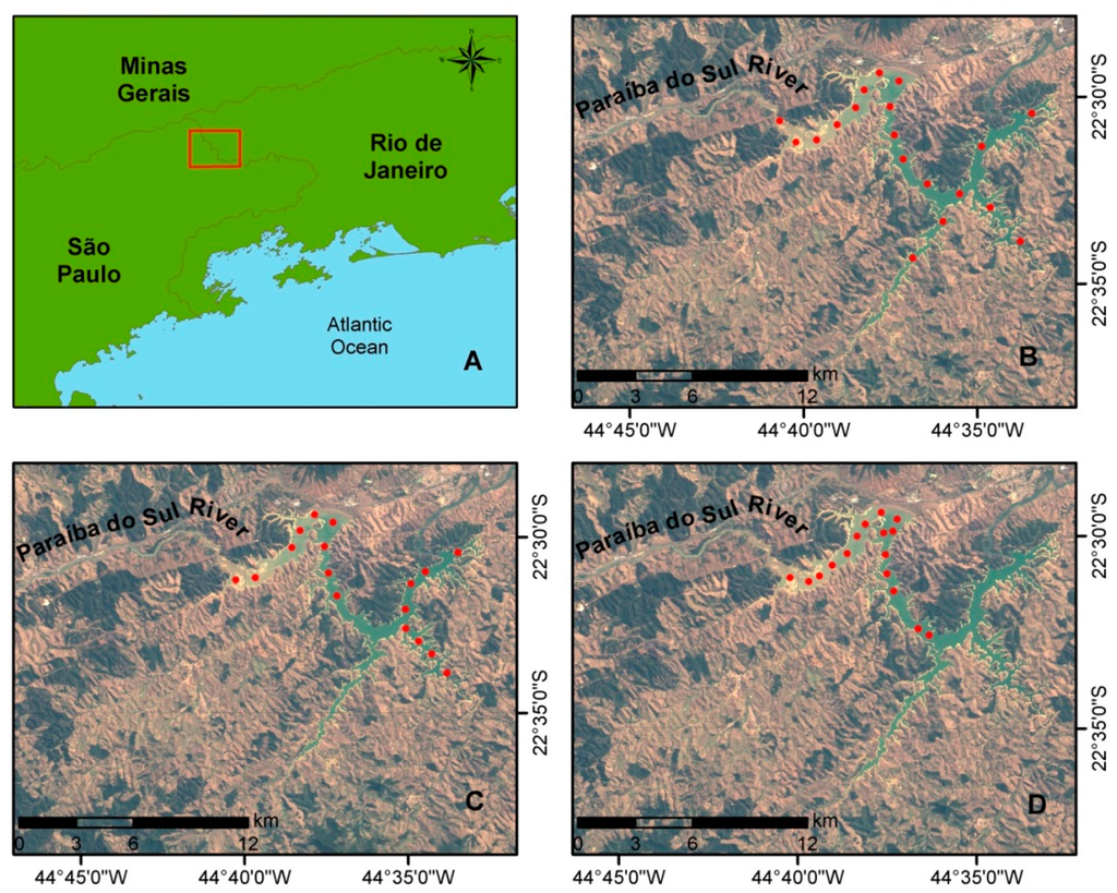 (A) Location of Funil Hydroelectric Reservoir. Sampling points from: (B) May 2012, (C) September 2012; and (D) April 2013. Color Composite TM-Landsat5 R3G2B1. Orbit/Point: 218/76. Date of Passage: 5 September 2011.