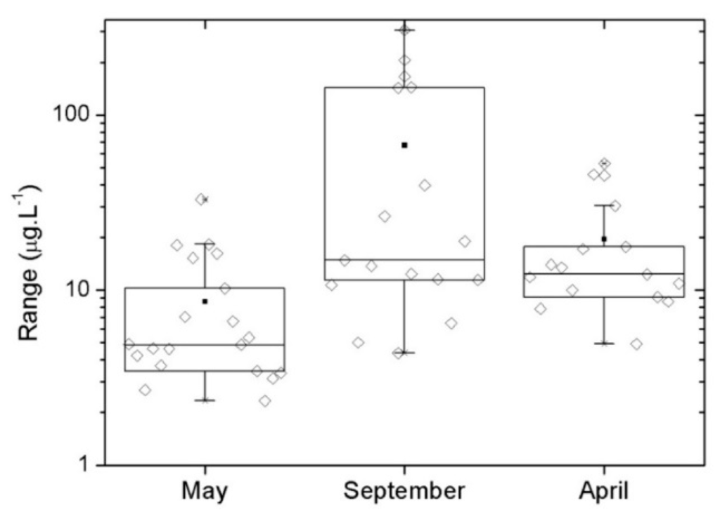 Table 1 and Figure 2 show the summary of chl-a data for the three campaigns. The datasets collected are representative for a large range of chl-a concentrations. The analysis of the standard deviation in Table 1 shows low values for May and April with higher value for September. We also observed the discrepancy between Average and Median values. In May and April they are cohesive, but in September they are distinct, which can be explained by the small number of high concentration values of chl-a in September. Those values influence the average, making it larger than the median as shown in Figure 2.